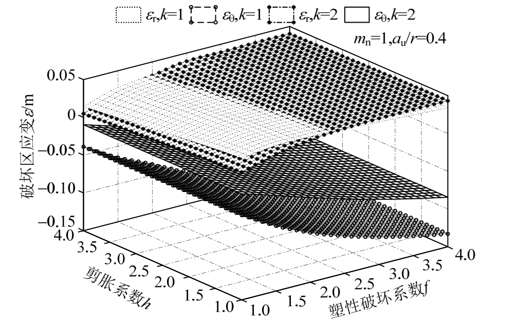 6) 为了确定塑性区及破坏区中的应变场,采用非相关联流动准则,平面应变条件下,塑性区及破坏区中内径向与环向塑性应变的关系分别为:
