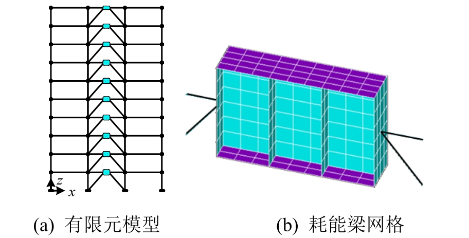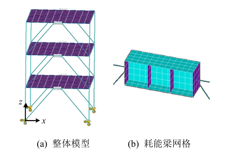 采用有限元分析软件ANSYS建立文献[8]中振动台试验试件的有限元模型(图2)。耗能梁和楼板采用4节点有限应变壳单元SHELL181模拟,框架梁、框架柱和支撑用BEAM 188单元模拟,耗能梁与框架梁之间用刚臂单元连接,楼板与框架梁铰接。材料模型选择双线性随动强化模型(BINH),切线模量E t=0.01E,屈服准则为 M ises屈服准则,其余材料力学性能参数采用文献[8]中材料单向拉伸试验数据。根据计算时长和计算精度,对作为主要变形和塑性发展区域的耗能梁,网格尺寸采用35 mm,其余部分网格尺寸为400 mm。分析中采用瑞利阻尼。
