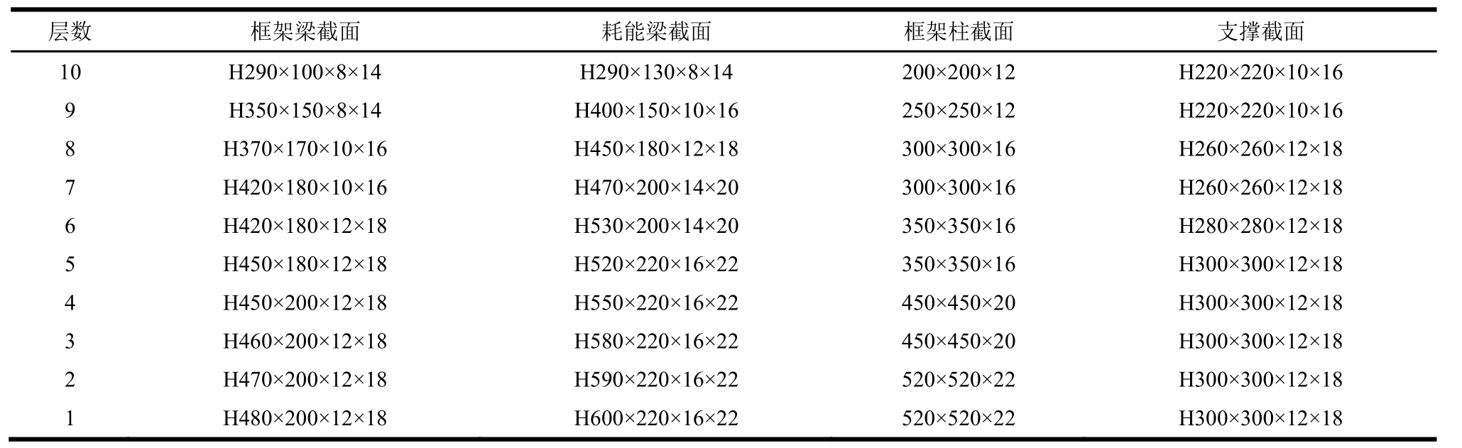 层数 框架梁截面 耗能梁截面 框架柱截面 支撑截面10 H290×100×8×14 H290×130×8×14 200×200×12 H220×220×10×16 9 H350×150×8×14 H400×150×10×16 250×250×12 H220×220×10×16 8 H370×170×10×16 H450×180×12×18 300×300×16 H260×260×12×18 7 H420×180×10×16 H470×200×14×20 300×300×16 H260×260×12×18 6 H420×180×12×18 H530×200×14×20 350×350×16 H280×280×12×18 5 H450×180×12×18 H520×220×16×22 350×350×16 H300×300×12×18 4 H450×200×12×18 H550×220×16×22 450×450×20 H300×300×12×18 3 H460×200×12×18 H580×220×16×22 450×450×20 H300×300×12×18 2 H470×200×12×18 H590×220×16×22 520×520×22 H300×300×12×18 1 H480×200×12×18 H600×220×16×22 520×520×22 H300×300×12×18
