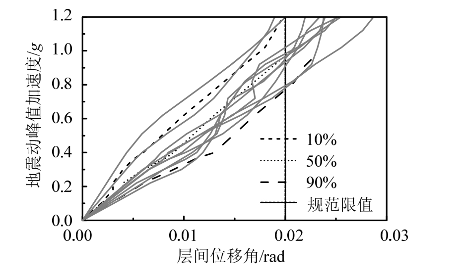 对模型进行增量动力分析,可得到结构从开始加载到倒塌全过程的最大层间位移角θd,进而得到结构性能响应参数(最大层间位移角 θd和均值 μθd)与PGA之间的关系曲线,即IDA曲线。图10给出了10条IDA曲线及概率分位曲线。以50%概率分位曲线代表结构在各种可能遭遇的地震作用下的平均反应水平,用10%和90%概率分位曲线即标准差曲线体现数据的离散性。由IDA曲线可以确定相应地震响应下结构所能抵抗的最大地震强度或不同地震强度下结构的地震响应。由图 10可知,当PGA超过0.82 g时,结构层间位移角可能超过规范限值 1/50,但可能性比较小,在平均地震响应下,当PGA超过0.92 g时,结构的层间位移角达到1/50,考虑数据的离散性,结构层间位移角达到1/50时,所能抵抗的最大地震强度是1.22 g。可见K-HSS-EBF能够抵抗远大于设防烈度的强震作用,有足够的安全储备。