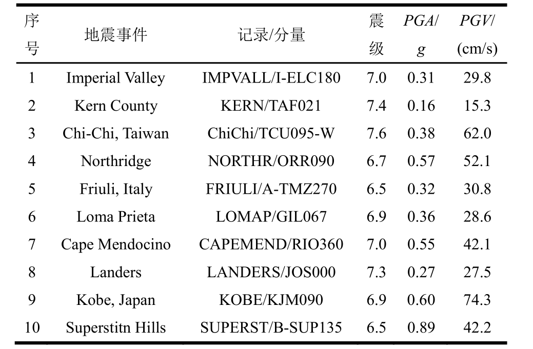 序号 地震事件 记录/分量 震级PGA/g PGV/(cm/s)1 Imperial Valley IMPVALL/I-ELC180 7.0 0.31 29.8 2 Kern County KERN/TAF021 7.4 0.16 15.3 3 Chi-Chi, Taiwan ChiChi/TCU095-W 7.6 0.38 62.0 4 Northridge NORTHR/ORR090 6.7 0.57 52.1 5 Friuli, Italy FRIULI/A-TMZ270 6.5 0.32 30.8 6 Loma Prieta LOMAP/GIL067 6.9 0.36 28.6 7 Cape Mendocino CAPEMEND/RIO360 7.0 0.55 42.1 8 Landers LANDERS/JOS000 7.3 0.27 27.5 9 Kobe, Japan KOBE/KJM 090 6.9 0.60 74.3 10 Superstitn Hills SUPERST/B-SUP135 6.5 0.89 42.2