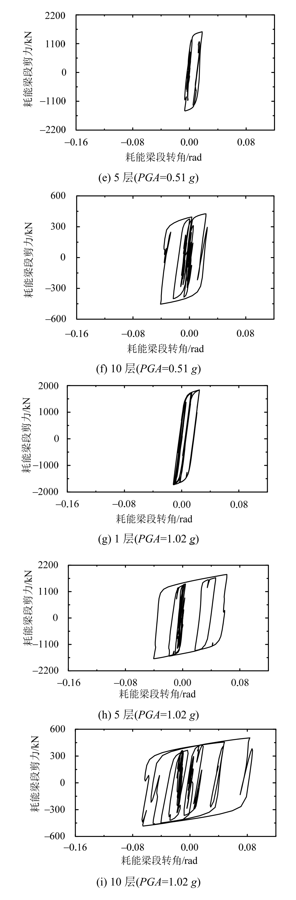 耗能梁变形是衡量K-KSS-EBFs结构抗震性能的重要参数。为研究K-KSS-EBFs结构中,耗能梁在不同水准地震作用下的变形情况,根据有限元分析结果,绘制了算例在Kobe波作用下1层、5层和10层的耗能梁剪力与耗能梁转角关系曲线,如图7所示。当PGA小于0.30 g时,各层耗能梁腹板均处于弹性阶段,当PGA达到0.30 g时,5层和10层耗能梁开始进入塑性阶段(图 7(b)、图 7(c));当PGA达到0.51 g,各层耗能梁均不同程度进入塑性状态(图7(d)、图7(e)和图7(f)),但框架梁柱和支撑均处于弹性状态,结构通过耗能梁塑性变形吸收地震能量,与设计意图相符;当PGA达到1.02 g时,层间位移角最大值达到 0.021 rad(图 8(a)),超过了规范限值,此时耗能梁腹板塑性变形更加充分(图7(g)、图 7(h)和图 7(i)),但结构的框架梁柱和支撑仍处于弹性状态。当PGA达到1.62 g时,结构框架梁等效应力超过Q690的屈服强度,进入塑性阶段,认定结构破坏,停止继续加载。此时,各层耗能梁变形更大(图 7(j)、图 7(k)和图 7(l)),结构 10层的层间位移角最大值达到 0.026 rad(图 8(a))。由以上分析可知,随着 PGA的增大,耗能梁首先进入塑性阶段,各层耗能梁转角逐渐增大,并依靠耗能梁塑性变形吸收强震能量,是结构的薄弱部位;层间位移角达到规范限值时,结构框架梁、柱和支撑均处于弹性状态,PGA达到1.62 g,结构破坏,说明算例有足够的安全储备。