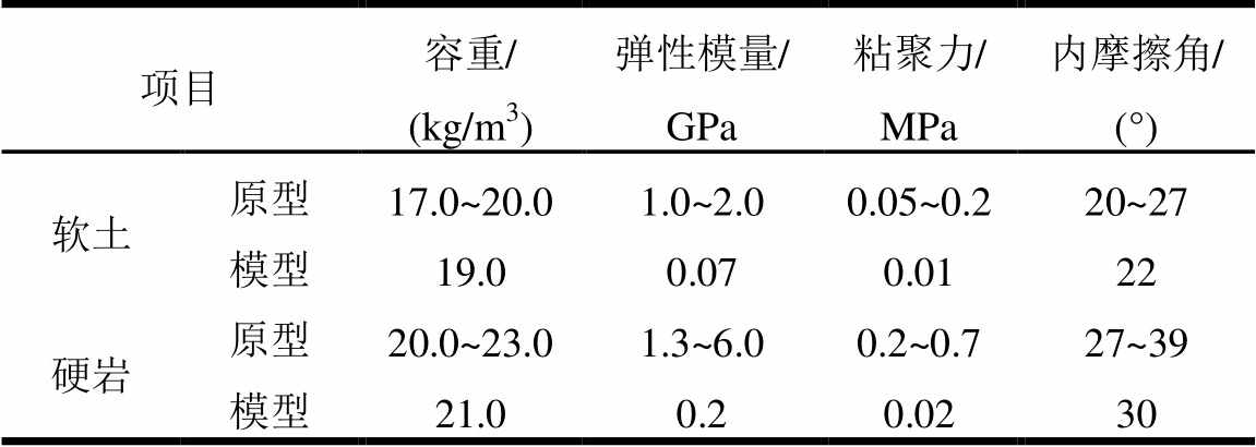 项目容重/(kg/m3)弹性模量/GPa粘聚力/MPa内摩擦角/ (°) 软土原型17.0~20.01.0~2.00.05~0.220~27 模型19.00.070.0122 硬岩原型20.0~23.01.3~6.00.2~0.727~39 模型21.00.20.0230