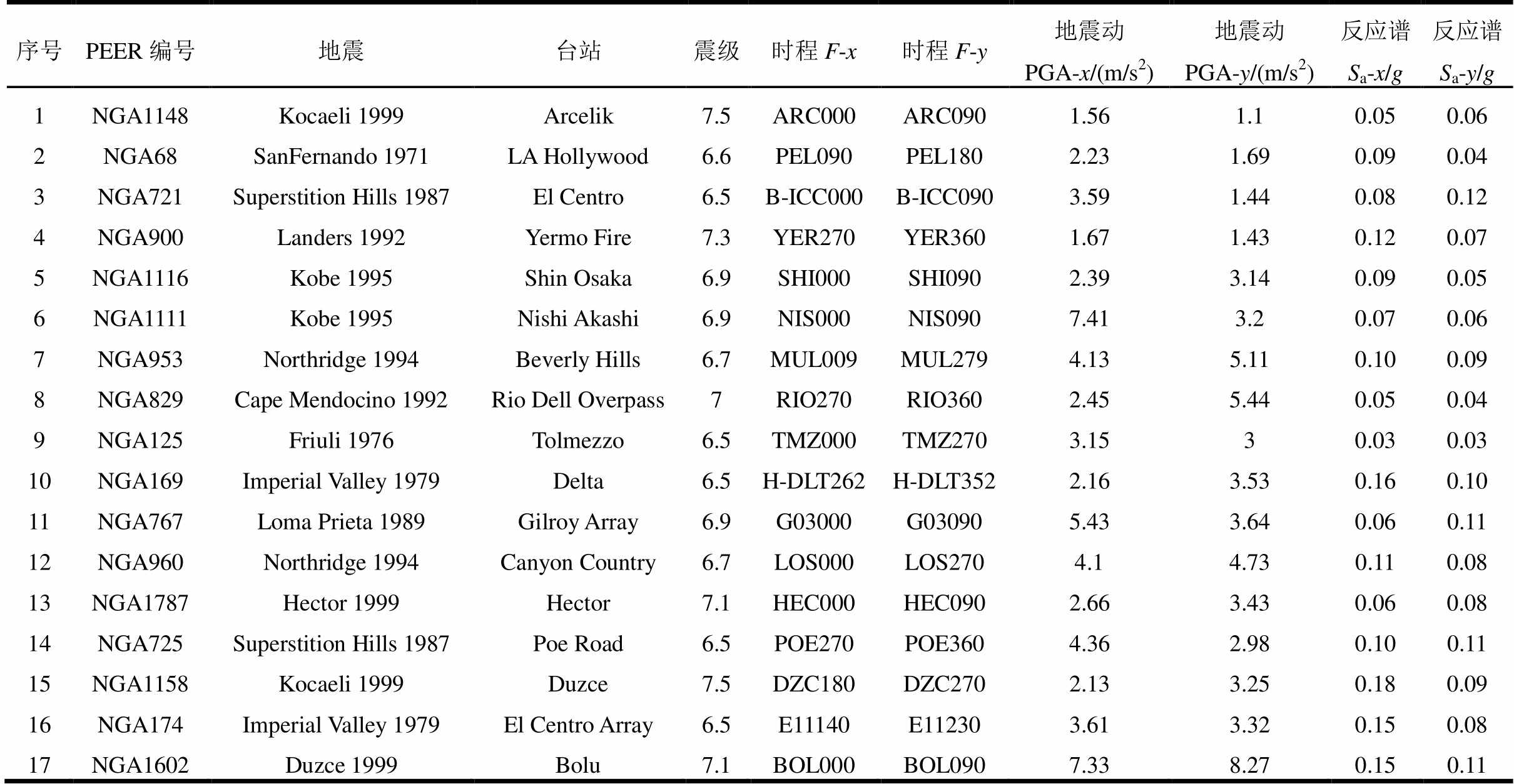 序号PEER编号地震台站震级时程F-x时程F-y地震动 PGA-x/(m/s2)地震动 PGA-y/(m/s2)反应谱Sa-x/g反应谱Sa-y/g 1NGA1148Kocaeli 1999Arcelik7.5ARC000ARC0901.561.10.05 0.06 2NGA68SanFernando 1971LA Hollywood6.6PEL090PEL1802.231.690.09 0.04 3NGA721Superstition Hills 1987El Centro6.5B-ICC000B-ICC0903.591.440.08 0.12 4NGA900Landers 1992Yermo Fire7.3YER270YER3601.671.430.12 0.07 5NGA1116Kobe 1995Shin Osaka6.9SHI000SHI0902.393.140.09 0.05 6NGA1111Kobe 1995Nishi Akashi6.9NIS000NIS0907.413.20.07 0.06 7NGA953Northridge 1994Beverly Hills6.7MUL009MUL2794.135.110.10 0.09 8NGA829Cape Mendocino 1992Rio Dell Overpass7RIO270RIO3602.455.440.05 0.04 9NGA125Friuli 1976Tolmezzo6.5TMZ000TMZ2703.1530.03 0.03 10NGA169Imperial Valley 1979Delta6.5H-DLT262H-DLT3522.163.530.16 0.10 11NGA767Loma Prieta 1989Gilroy Array6.9G03000G030905.433.640.06 0.11 12NGA960Northridge 1994Canyon Country 6.7LOS000LOS2704.14.730.11 0.08 13NGA1787Hector 1999Hector7.1HEC000HEC0902.663.430.06 0.08 14NGA725Superstition Hills 1987Poe Road6.5POE270POE3604.362.980.10 0.11 15NGA1158Kocaeli 1999Duzce7.5DZC180DZC2702.133.250.18 0.09 16NGA174Imperial Valley 1979El Centro Array6.5E11140E112303.613.320.15 0.08 17NGA1602Duzce 1999Bolu7.1BOL000BOL0907.338.270.15 0.11