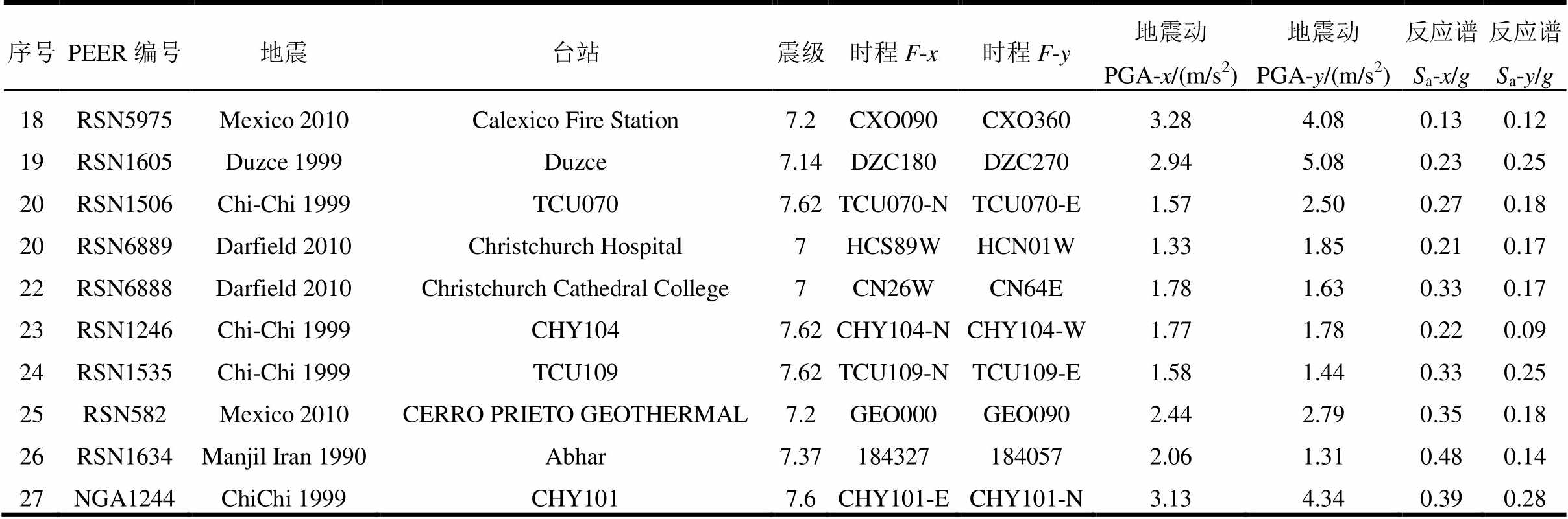 序号PEER编号地震台站震级时程F-x时程F-y地震动 PGA-x/(m/s2)地震动 PGA-y/(m/s2)反应谱Sa-x/g反应谱Sa-y/g 18RSN5975Mexico 2010Calexico Fire Station7.2CXO090CXO3603.284.080.130.12 19RSN1605Duzce 1999Duzce7.14DZC180DZC2702.945.080.230.25 20RSN1506Chi-Chi 1999TCU0707.62TCU070-NTCU070-E1.572.500.270.18 20RSN6889Darfield 2010Christchurch Hospital7HCS89WHCN01W1.331.850.210.17 22RSN6888Darfield 2010Christchurch Cathedral College7CN26WCN64E1.781.630.330.17 23RSN1246Chi-Chi 1999CHY1047.62CHY104-NCHY104-W1.771.780.220.09 24RSN1535Chi-Chi 1999TCU1097.62TCU109-NTCU109-E1.581.440.330.25 25RSN582Mexico 2010CERRO PRIETO GEOTHERMAL7.2GEO000GEO0902.442.790.350.18 26RSN1634Manjil Iran 1990Abhar7.371843271840572.061.310.480.14 27NGA1244ChiChi 1999CHY1017.6CHY101-ECHY101-N3.134.340.390.28