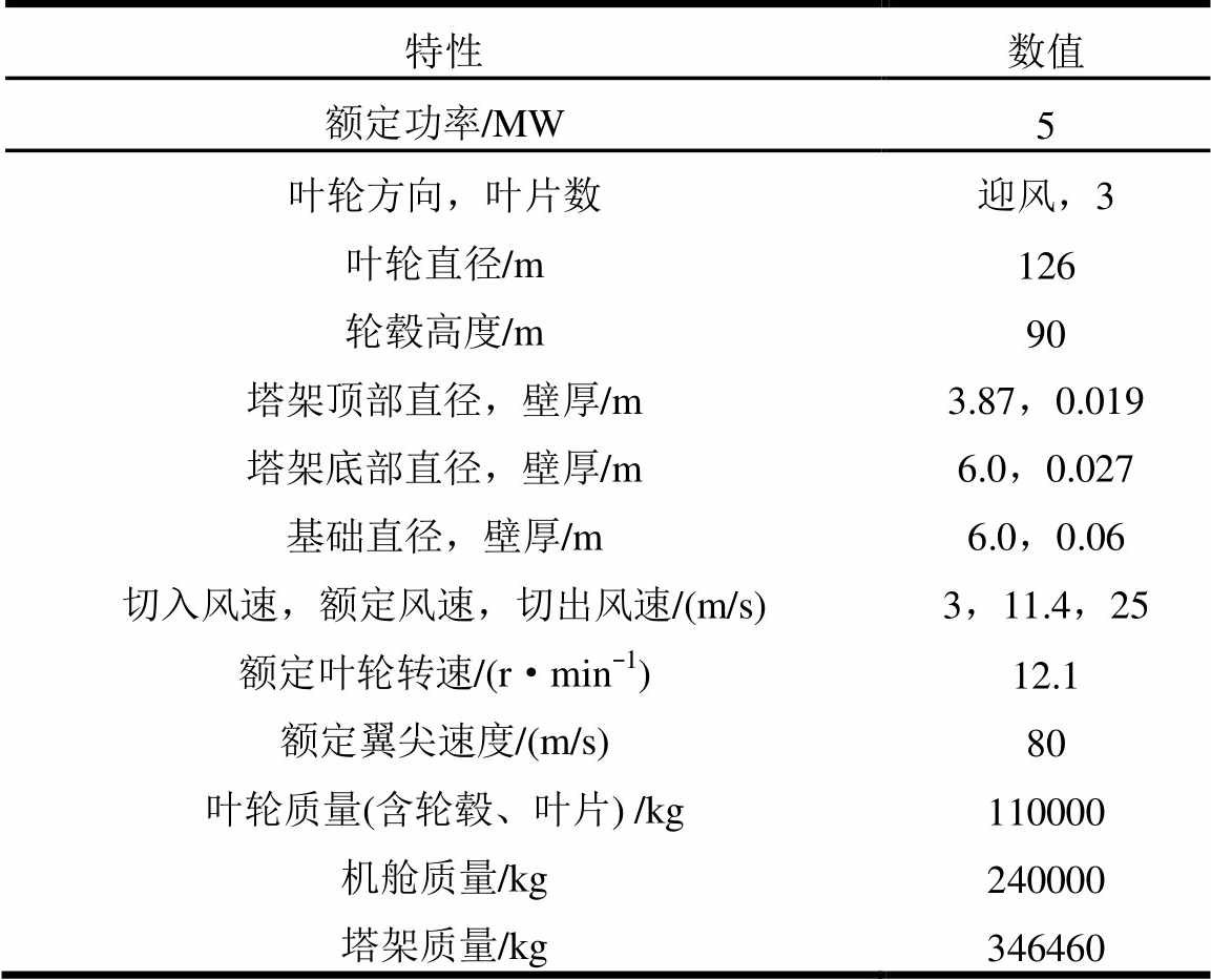 特性数值 额定功率/MW5 叶轮方向,叶片数迎风,3 叶轮直径/m126 轮毂高度/m90 塔架顶部直径,壁厚/m3.87,0.019 塔架底部直径,壁厚/m6.0,0.027 基础直径,壁厚/m6.0,0.06 切入风速,额定风速,切出风速/(m/s)3,11.4,25 额定叶轮转速/(r·min−1)12.1 额定翼尖速度/(m/s)80 叶轮质量(含轮毂、叶片) /kg110000 机舱质量/kg240000 塔架质量/kg346460