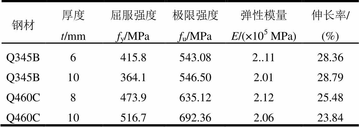 钢材厚度t/mm屈服强度fy/MPa极限强度fu/MPa弹性模量E/(×105 MPa)伸长率/(%) Q345B6415.8543.082..1128.36 Q345B10364.1546.502.0128.79 Q460C8473.9635.122.1225.48 Q460C10516.7692.362.0623.84