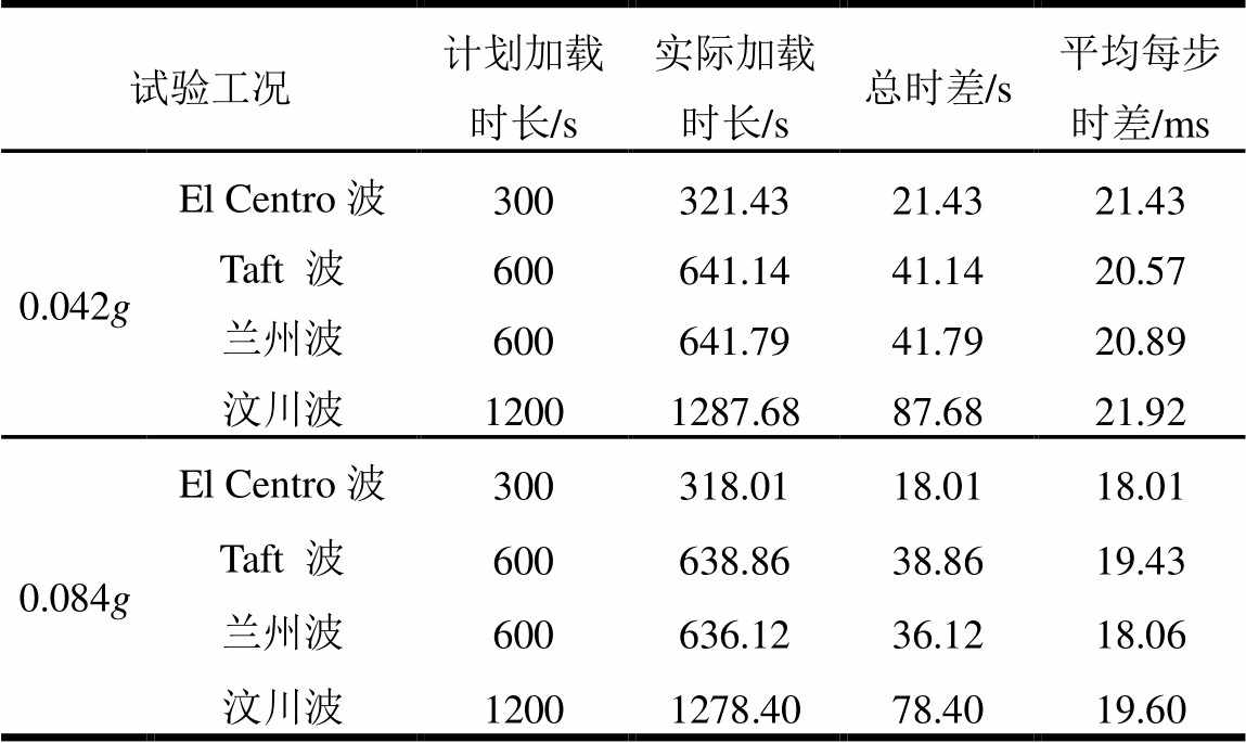 试验工况计划加载时长/s实际加载时长/s总时差/s平均每步时差/ms 0.042gEl Centro波300321.4321.4321.43 Taft 波600641.1441.1420.57 兰州波600641.7941.7920.89 汶川波12001287.6887.6821.92 0.084gEl Centro波300318.0118.0118.01 Taft 波600638.8638.8619.43 兰州波600636.1236.1218.06 汶川波12001278.4078.4019.60