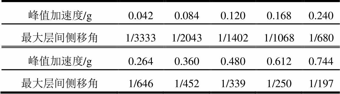 峰值加速度/g0.0420.0840.1200.1680.240 最大层间侧移角1/33331/20431/14021/10681/680 峰值加速度/g0.2640.3600.4800.6120.744 最大层间侧移角1/6461/4521/3391/2501/197