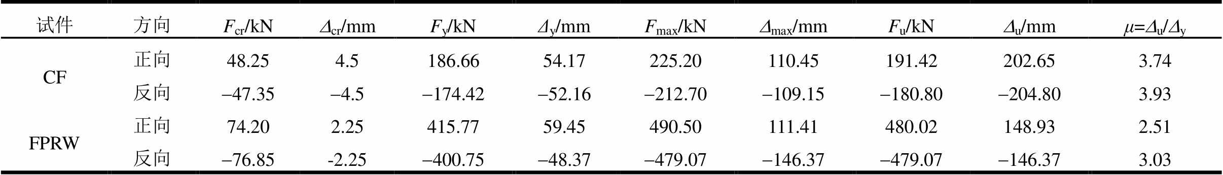 试件方向Fcr/kNDcr/mmFy/kNΔy/mmFmax/kNDmax/mmFu/kNDu/mmμ=Du/Dy CF正向48.254.5186.6654.17225.20110.45191.42202.653.74 反向-47.35-4.5-174.42-52.16-212.70-109.15-180.80-204.803.93 FPRW正向74.202.25415.7759.45490.50111.41480.02148.932.51 反向-76.85-2.25-400.75-48.37-479.07-146.37-479.07-146.373.03