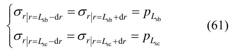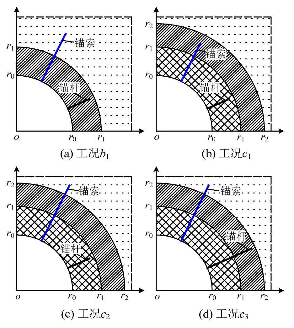 图6中工况c2表示破碎区产生时,锚杆伸入破碎区,锚索伸入弹性区,此时求解需要满足的边界条件形式与3.3节第6种工况基本相同,此外还需满足式(61)。