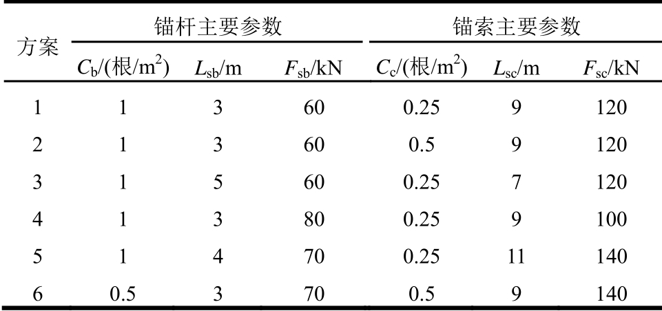 方案 锚杆主要参数 锚索主要参数 Cb/(根/m2) Lsb/m Fsb/kN Cc/(根/m2) Lsc/m Fsc/kN 1 1 3 60 0.25 9 120 2 1 3 60 0.5 9 120 3 1 5 60 0.25 7 120 4 1 3 80 0.25 9 100 5 1 4 70 0.25 11 140 6 0.5 3 70 0.5 9 140