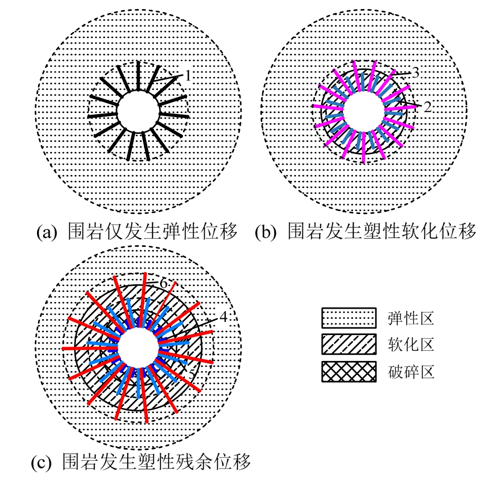 与喷射混凝土、钢架等作用于隧道表面的支护形式不同,锚杆、锚索深入围岩内部,既可约束深层围岩变形的发展,又可加固浅层围岩,控制浅层围岩的扩展,其作用原理具体如下:
