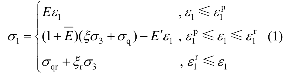 由图2可知,岩土在弹性阶段服从胡克定律,在塑性软化阶段围岩强度随着应变增加而降低直至达到残余强度,对于此三线性应力-应变模型,本构关系表达式为: