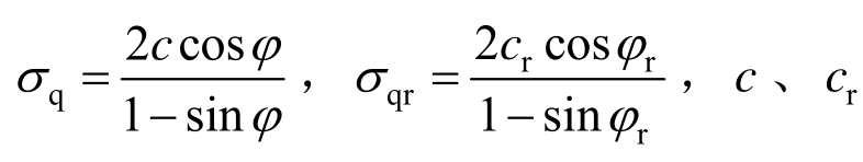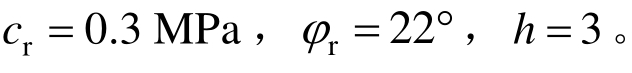 分别为岩体软化阶段和残余阶段的统一黏聚力,φ、φr分别为岩体软化阶段和残余阶段的统一内摩擦角;ξ、ξr为与岩体力学参数有关的常数,且有