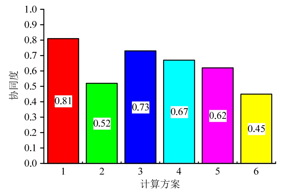经式(78)检验表明,本文初步选取的各计算方案锚杆(索)均处于弹性状态。利用式(77)对各计算方案的协同度进行计算,结果如图10所示。