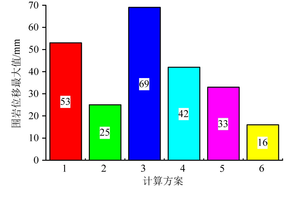 ① 协同效果最好的计算方案为方案1,协同效果较差的为方案6,这说明围岩变形控制效果好时锚固体系协同度并不一定大,需要通过协同优化设计寻求最优方案。综合以上分析可知,本算例中最优组合方案为方案1,围岩变形量为53 mm,满足施工要求。
