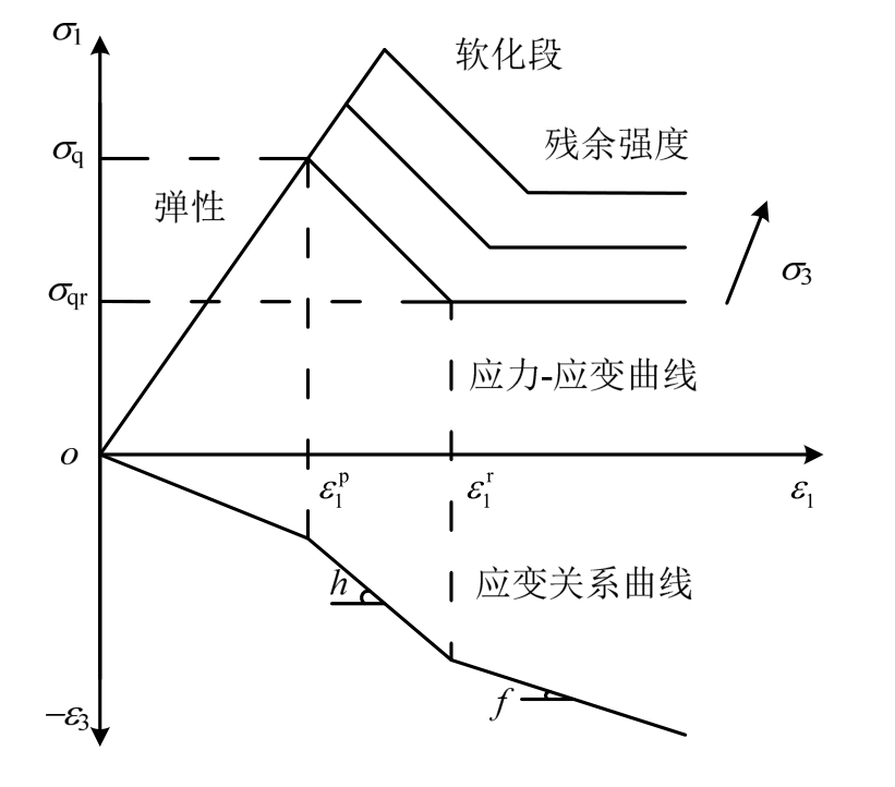 研究表明,作为隧道围岩的大部分岩土材料通常表现为应变软化行为[12],可运用弹性-塑性软化-塑性残余三线性应力-应变模型进行描述,如图2所示[13]。图2中,h、f分别为软化区和破碎区的扩容系数;