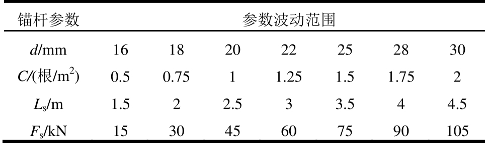锚杆参数 参数波动范围 d/mm 16 18 20 22 25 28 30 C/(根/m2) 0.5 0.75 1 1.25 1.5 1.75 2 Ls/m 1.5 2 2.5 3 3.5 4 4.5 Fs/kN 15 30 45 60 75 90 105