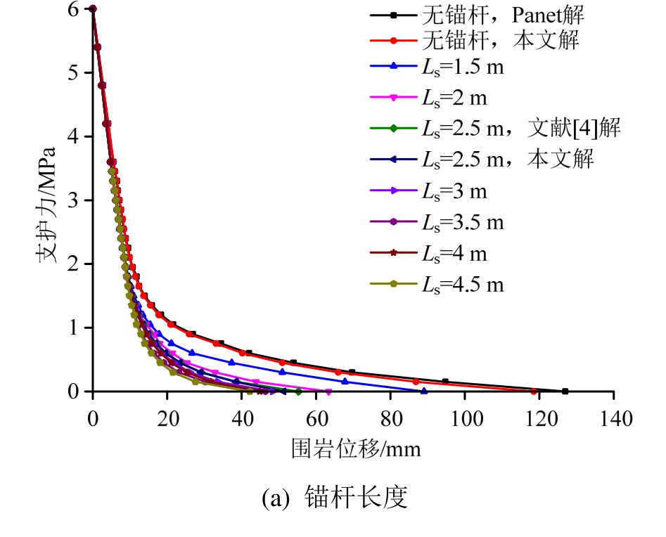 在研究某一个参数变化(sE除外)对围岩特性曲线影响时,锚杆弹性模量sE=200 GPa,其他参数取7种情况中的最小值。特别地,为了验证本文计算方法的正确性,令本文公式中锚杆直径 0d= 进行计算模拟无锚杆情况,并将计算结果与Panet[26]得到的经典位移解进行对比研究,同时将Ls=2.5 m时本文计算结果与文献[4]进行对比,结果如图8 所示。