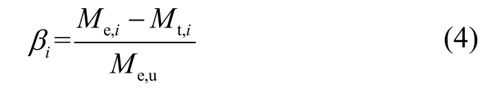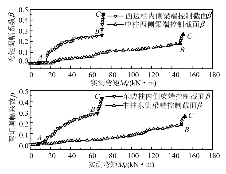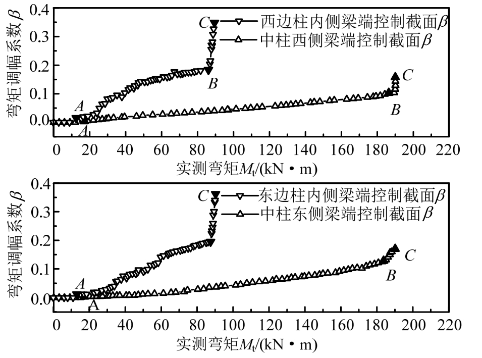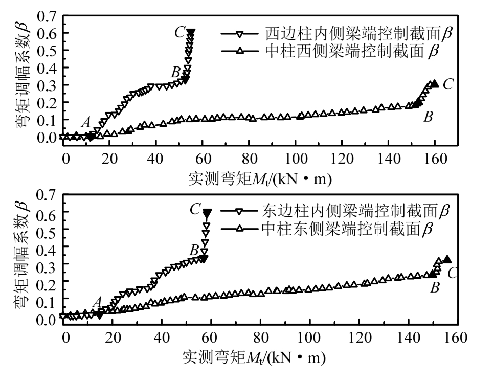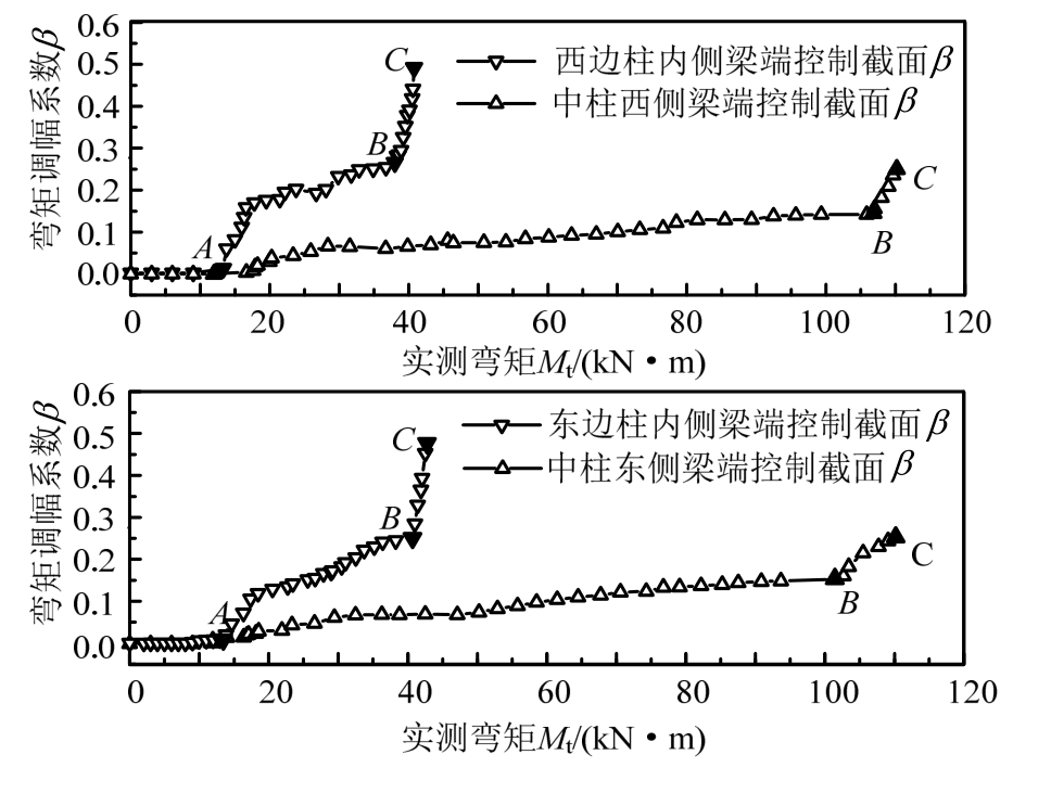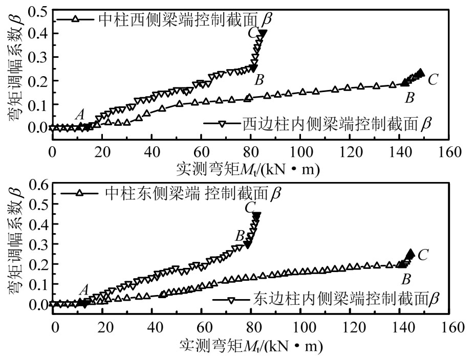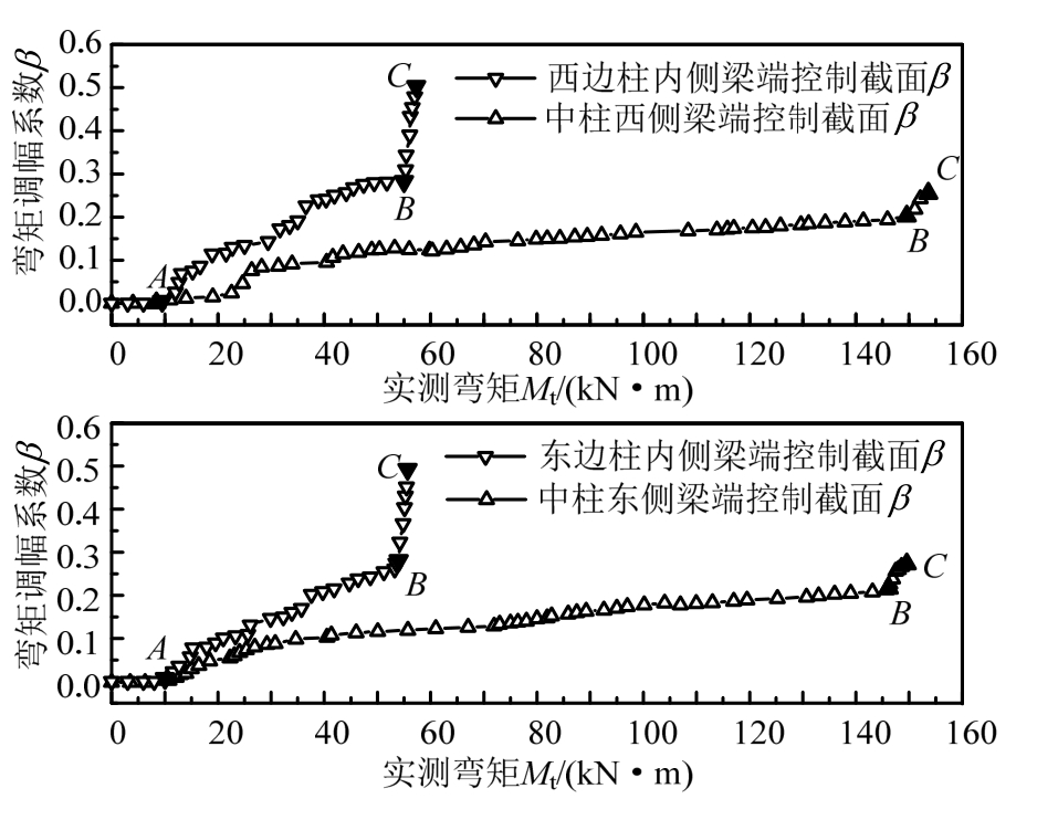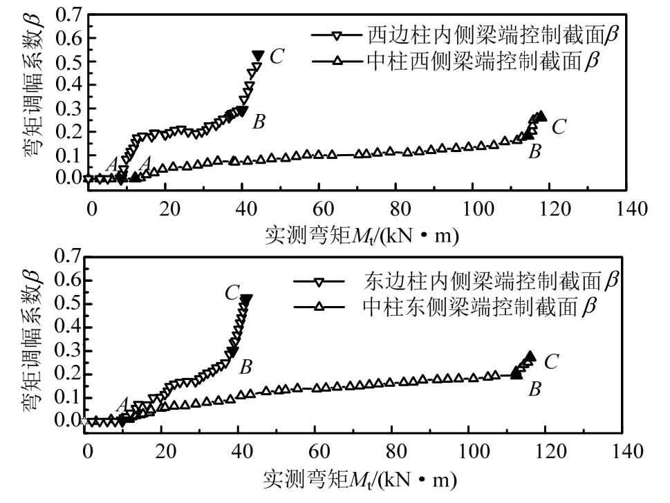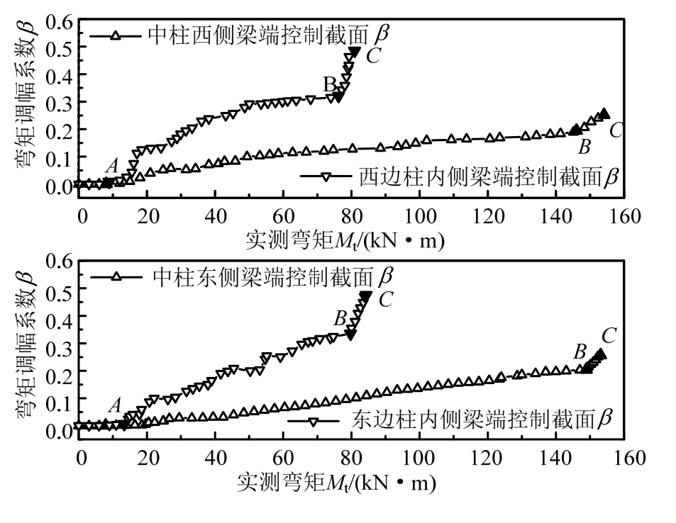 由框架柱端控制截面处每根纵筋的实测应变值及截面内力平衡条件可计算确定框架梁端控制截面实际弯矩值;由外荷载可计算确定框架梁端控制截面的弹性弯矩值,则各级荷载作用下梁端控制截面弯矩调幅系数按式(4)计算。