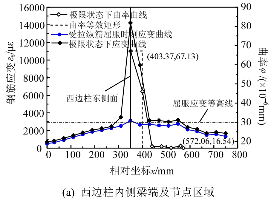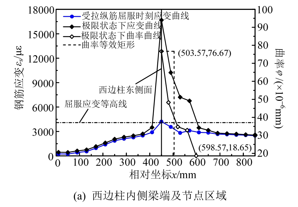 图10 KJ-B-1框架梁端附近区域及柱截面高度范围内钢筋拉应变分布及曲率分布
