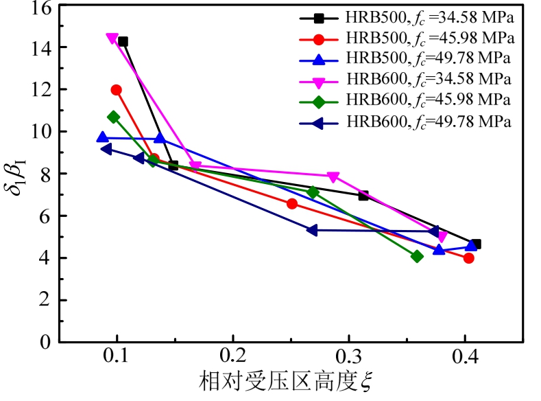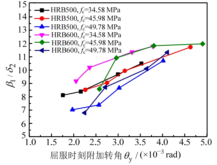 当fy和fc相同时,令δ1=100/θy、δ2=0.01/ξ0.5,则δ1βI随ξ的变化情况如图30所示、βI/δ2随屈服时刻应变渗透引起的梁端附加转角θy的变化情况如图31所示。可以看出,第一阶段弯矩调幅系数随ξ的增加而减小(见图30),随θy的增大而增大(见 图31)。