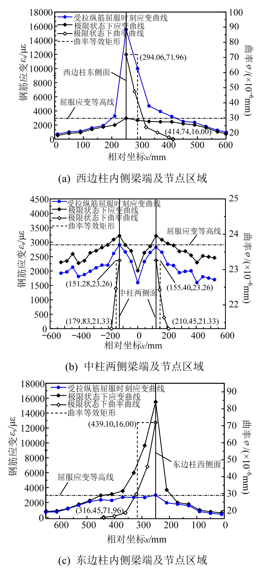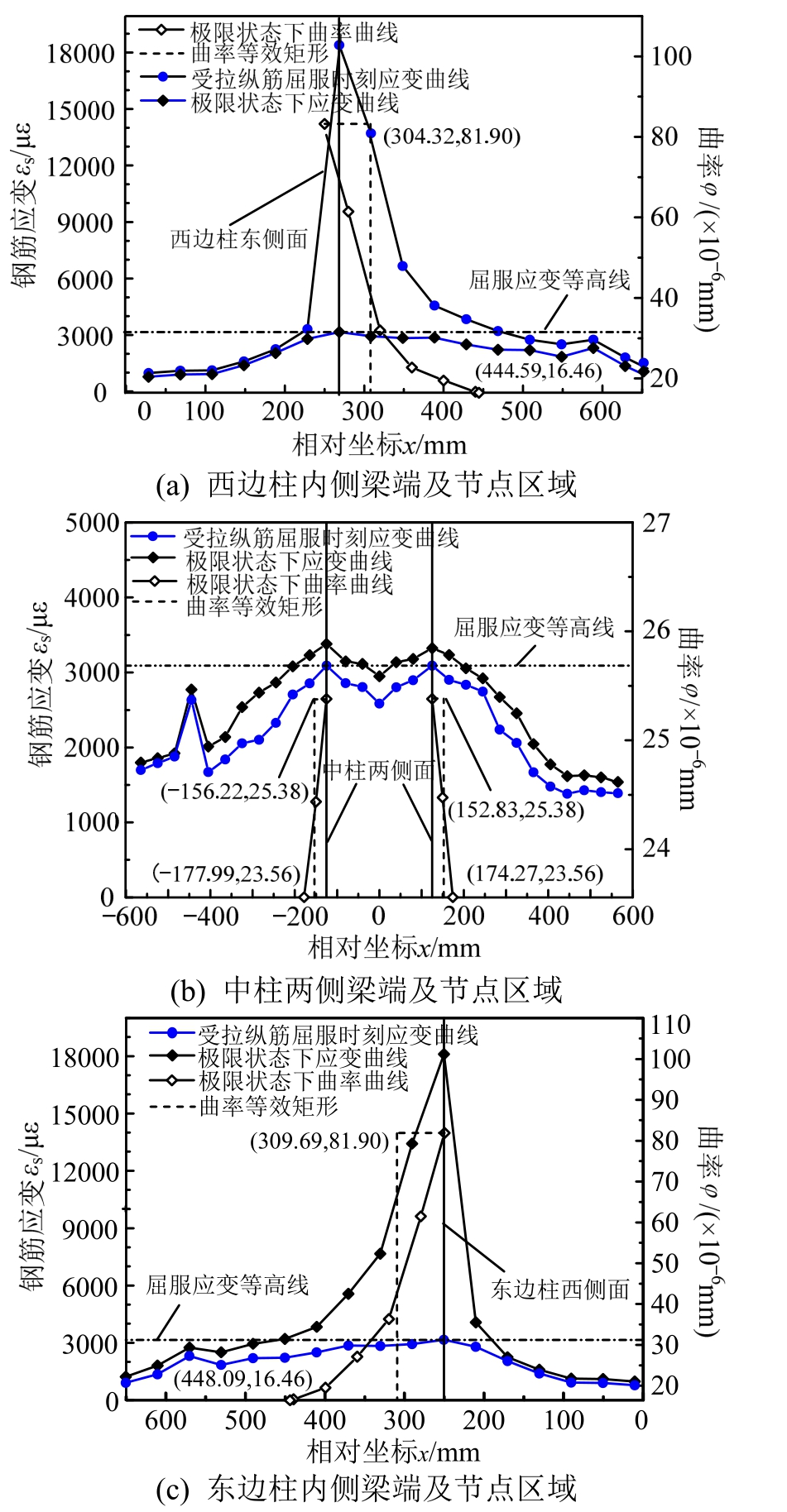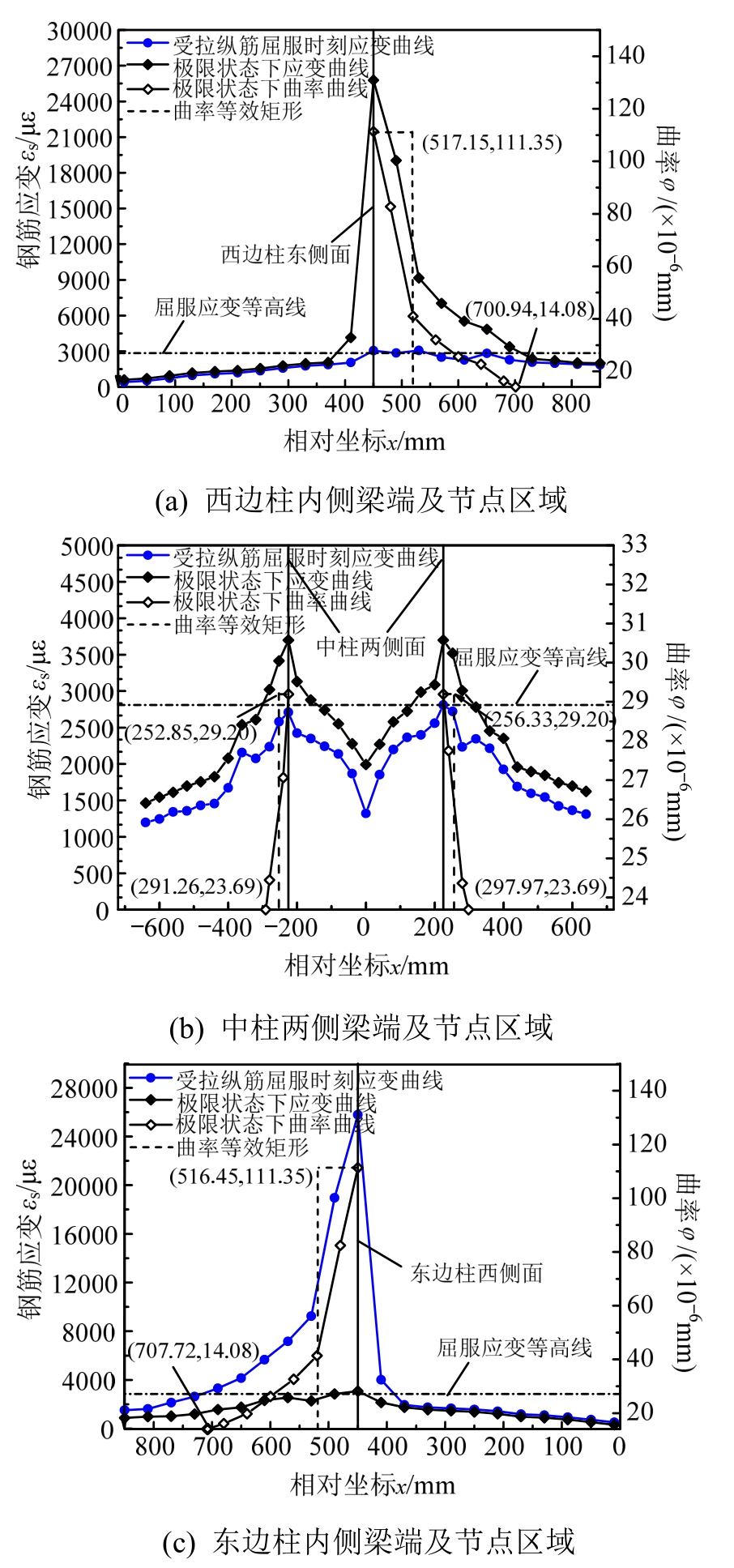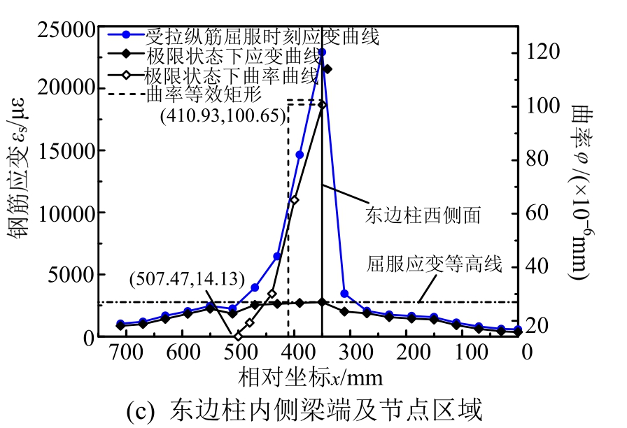 图12 KJ-B-3框架梁端附近区域及柱截面高度范围内钢筋拉应变分布及曲率分布