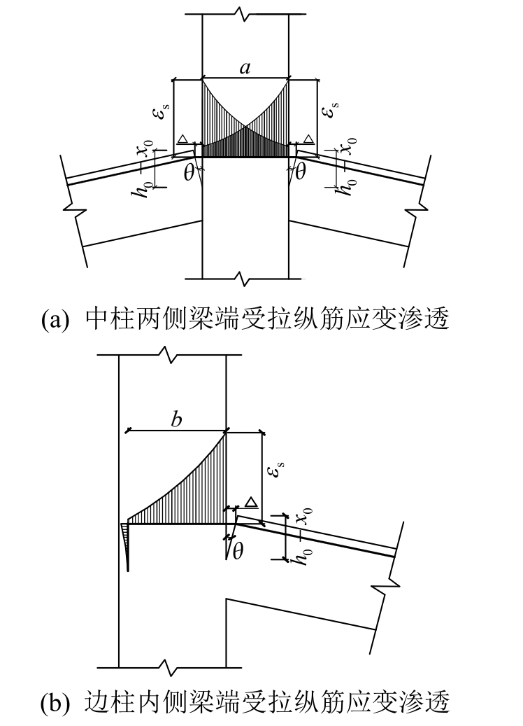 应变渗透是指在外荷载作用下框架梁端控制截面受拉钢筋在梁柱节点内的锚固区段存在拉伸应变的现象[13]。该拉伸应变使得节点内的受拉纵筋在梁端控制截面存在一定滑移值,该滑移值与梁端控制截面受拉区高度的比值即为应变渗透引起的附加转角。中柱两侧梁端及边柱内侧梁端受拉纵筋应变渗透分别如图16(a)、图16(b)所示。
