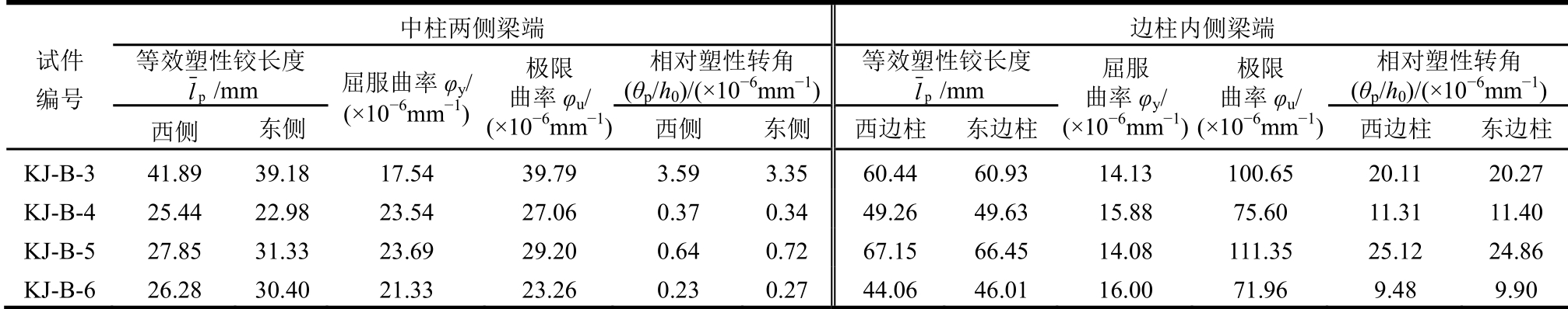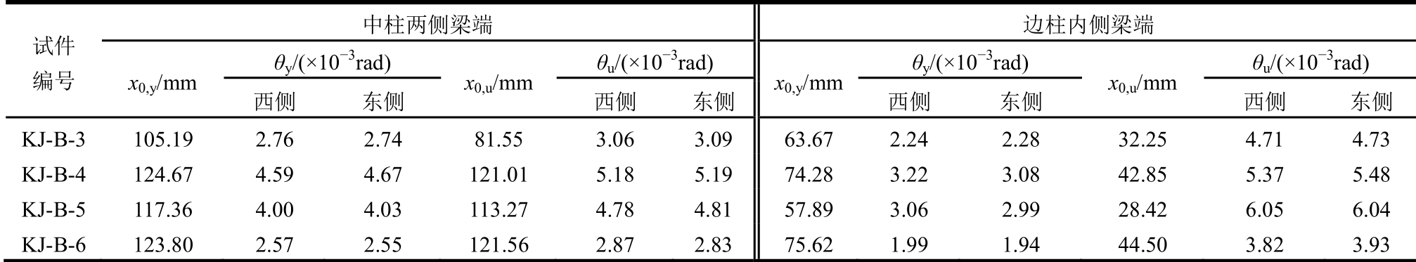 试件 编号 中柱两侧梁端 边柱内侧梁端 x0,y/mm θy/(×10-3rad) x0,u/mm θu/(×10-3rad) x0,y/mm θy/(×10-3rad) x0,u/mm θu/(×10-3rad)西侧 东侧 西侧 东侧 西侧 东侧 西侧 东侧 KJ-A-1 106.67 2.39 2.32 93.06 2.94 2.92 56.39 1.97 2.13 31.11 4.34 4.37 KJ-A-2 126.87 3.79 3.77 123.43 4.22 4.21 79.06 3.31 3.31 54.42 5.40 5.51 KJ-A-3 101.53 2.96 2.96 87.37 3.27 3.28 57.11 2.58 2.57 31.46 5.23 5.22 KJ-A-4 111.76 4.81 4.99 107.60 5.29 5.34 68.61 3.82 3.78 42.52 6.22 6.31 KJ-A-5 103.69 4.11 4.10 87.46 4.82 4.89 55.09 3.67 3.61 29.79 6.62 6.66 KJ-A-6 118.84 2.70 2.72 116.82 2.95 2.96 68.34 2.24 2.25 38.89 4.15 4.11 KJ-B-1 115.30 2.15 2.16 101.57 2.81 2.78 65.59 1.73 1.78 34.17 4.12 4.16 KJ-B-2 124.37 3.49 3.56 122.90 4.20 4.16 81.62 3.01 2.98 48.25 5.24 5.33
