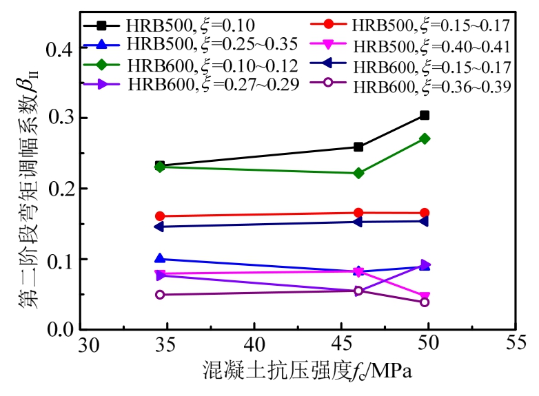 当fy、ξ和lah/d相同时,第二阶段弯矩调幅βII随fc的变化情况如图37所示。可以看出,在C40~C60间第二阶段弯矩调幅幅度变化规律并不明显。