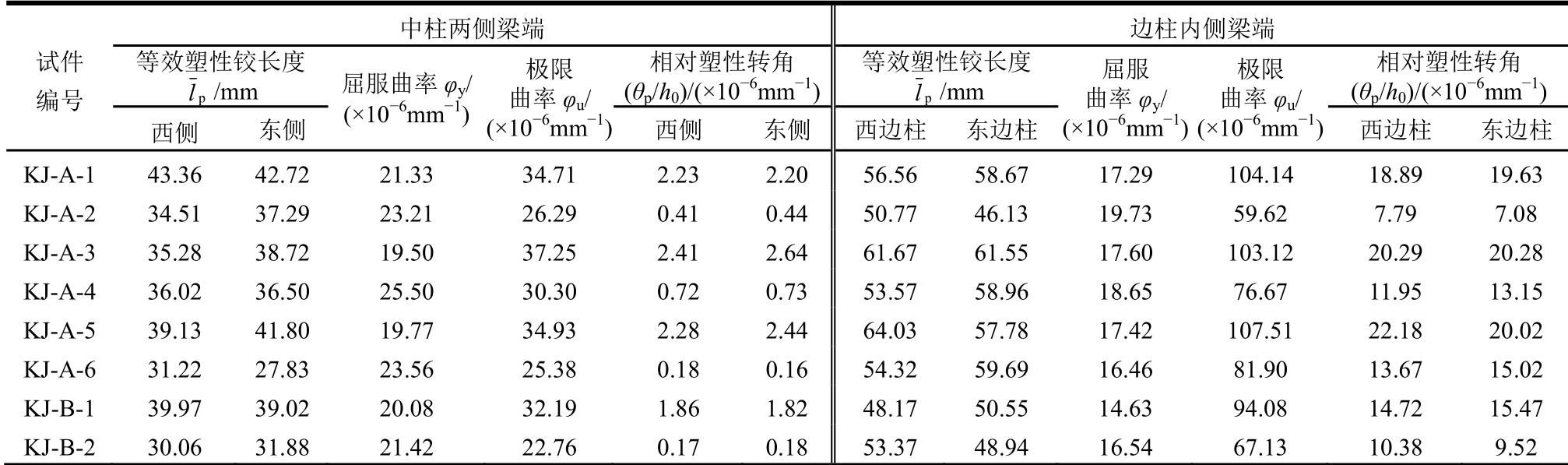 试件 编号 中柱两侧梁端 边柱内侧梁端 等效塑性铰长度 p l/mm 屈服曲率φy/ (×10-6mm-1)极限 曲率φu/ (×10-6mm-1)相对塑性转角 (θp/h0)/(×10-6mm-1)等效塑性铰长度 p l/mm 屈服 曲率φy/ (×10-6mm-1)极限 曲率φu/ (×10-6mm-1)相对塑性转角 (θp/h0)/(×10-6mm-1)西侧 东侧 西侧 东侧 西边柱 东边柱 西边柱 东边柱KJ-A-1 43.36 42.72 21.33 34.71 2.23 2.20 56.56 58.67 17.29 104.14 18.89 19.63 KJ-A-2 34.51 37.29 23.21 26.29 0.41 0.44 50.77 46.13 19.73 59.62 7.79 7.08 KJ-A-3 35.28 38.72 19.50 37.25 2.41 2.64 61.67 61.55 17.60 103.12 20.29 20.28 KJ-A-4 36.02 36.50 25.50 30.30 0.72 0.73 53.57 58.96 18.65 76.67 11.95 13.15 KJ-A-5 39.13 41.80 19.77 34.93 2.28 2.44 64.03 57.78 17.42 107.51 22.18 20.02 KJ-A-6 31.22 27.83 23.56 25.38 0.18 0.16 54.32 59.69 16.46 81.90 13.67 15.02 KJ-B-1 39.97 39.02 20.08 32.19 1.86 1.82 48.17 50.55 14.63 94.08 14.72 15.47 KJ-B-2 30.06 31.88 21.42 22.76 0.17 0.18 53.37 48.94 16.54 67.13 10.38 9.52