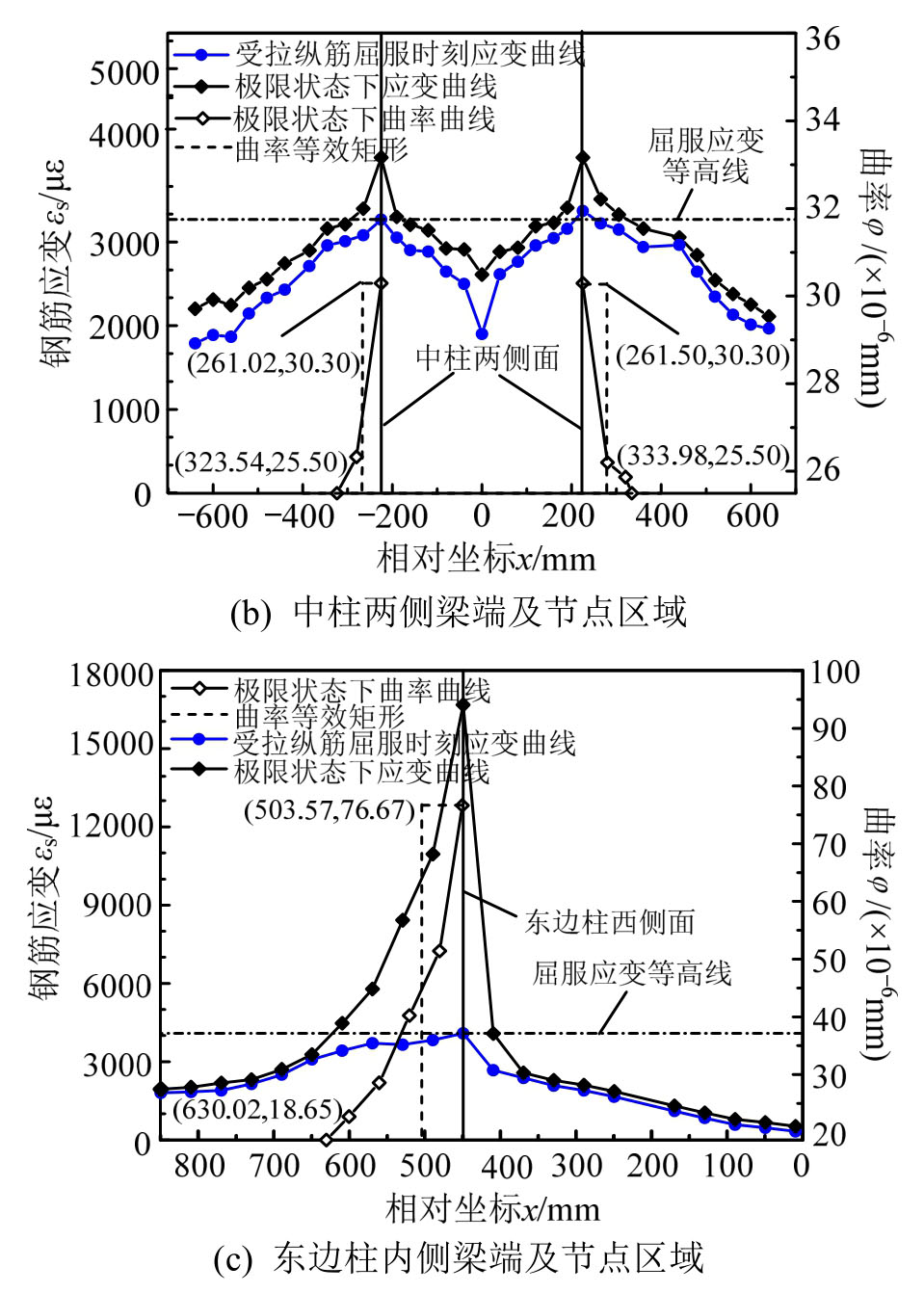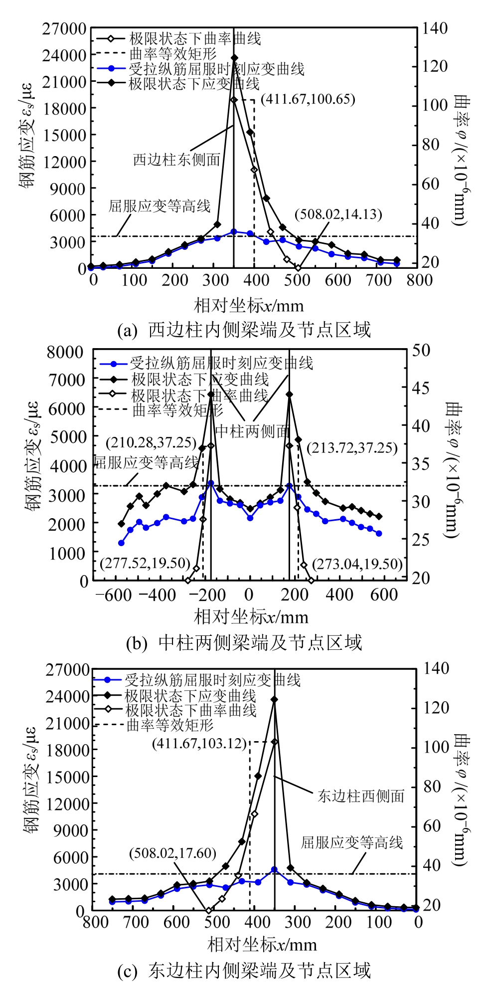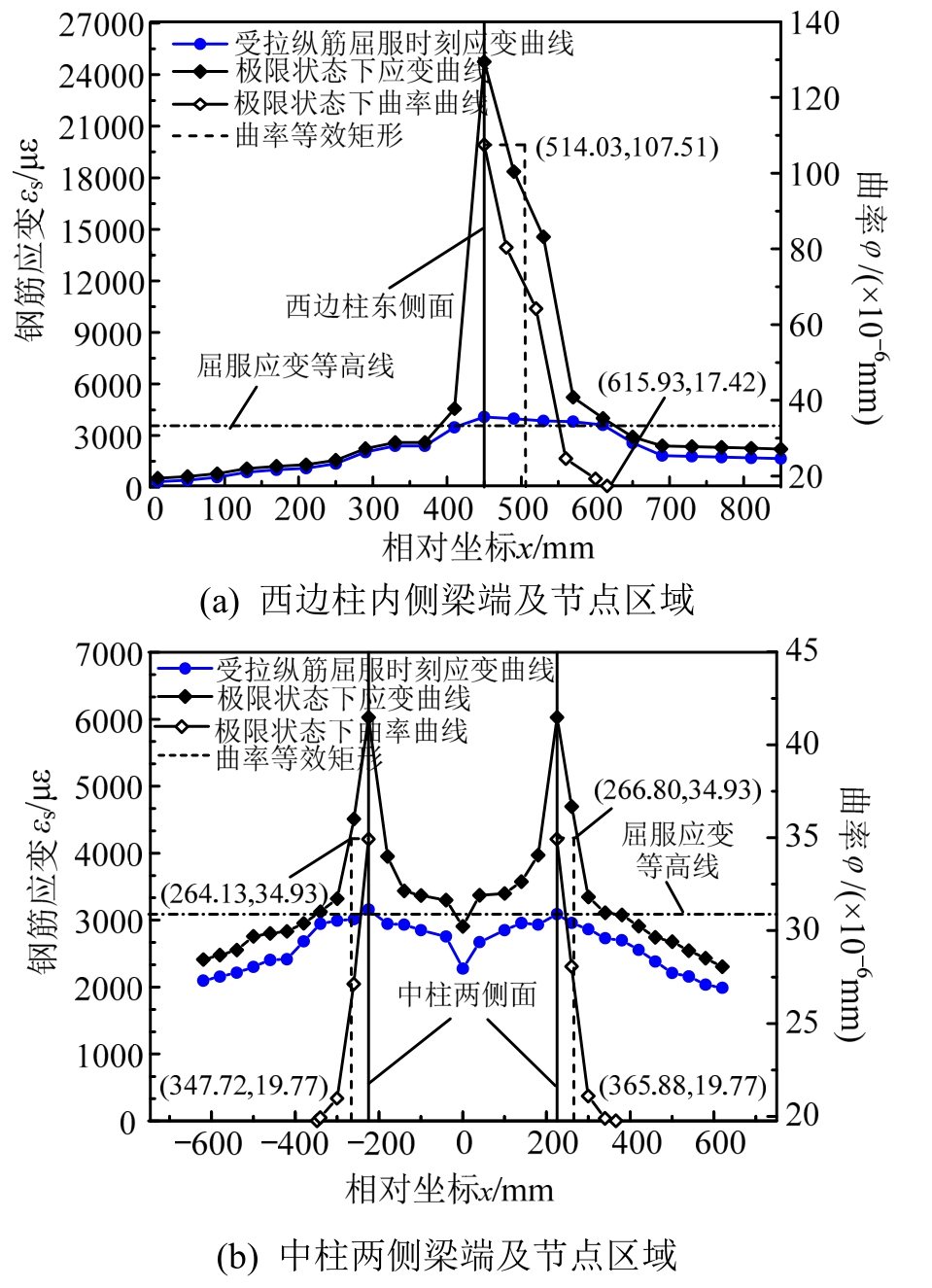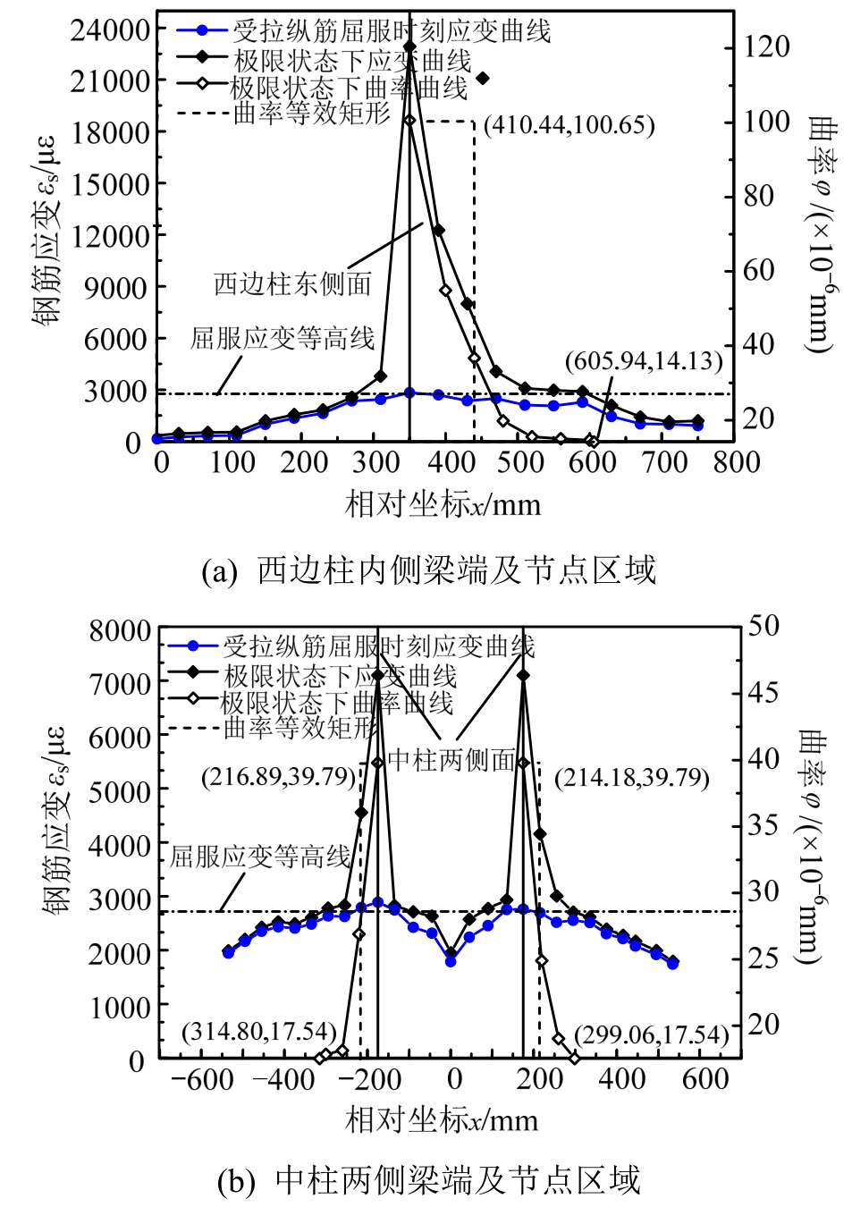 图13 KJ-B-4框架梁端附近区域及柱截面高度范围内钢筋拉应变分布及曲率分布