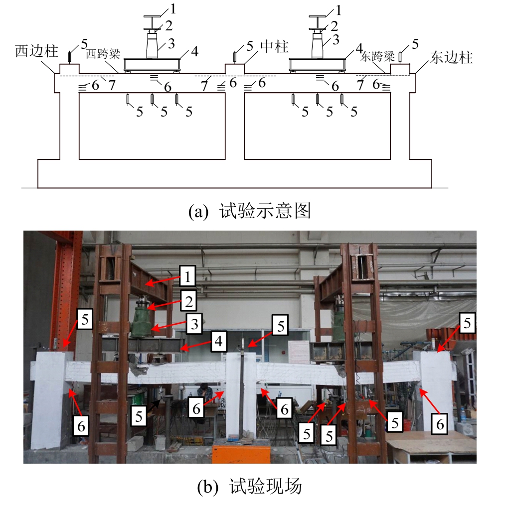 1-反力梁;2-加载传感器;3-2000kN千斤顶;4-分配梁; 5-位移计;6-混凝土应变片;7-钢筋应变片