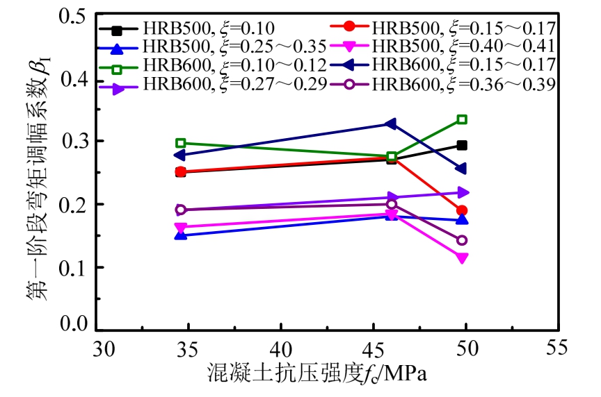 图32为fy、ξ、lah/d相同时,第一阶段弯矩调幅系数βI随fc的变化情况。由图可知,C40~C60混凝土抗压强度的变化对第一阶段弯矩调幅幅度影响并不明显。