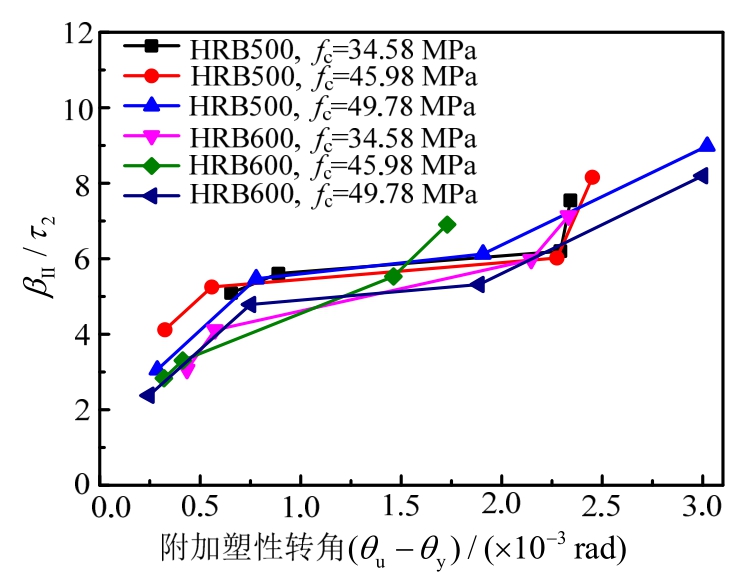 当fy和fc相 同 时,令τ1=100/(θu-θy)0.3、τ2=0.01/ξ0.5,可得τ1·βII随ξ的变化情况如图35所示、βII/τ2随(θu-θy)变化情况如图36所示。由于ξ的增大使截面极限曲率减小,塑性铰转动能力降低,故βII随ξ的增大而减小(见图35)。由于梁端附加塑性转角(θu-θy)的增加对总塑性转角有有利贡献,故βII随(θu-θy)的增加而增大(见图36)。