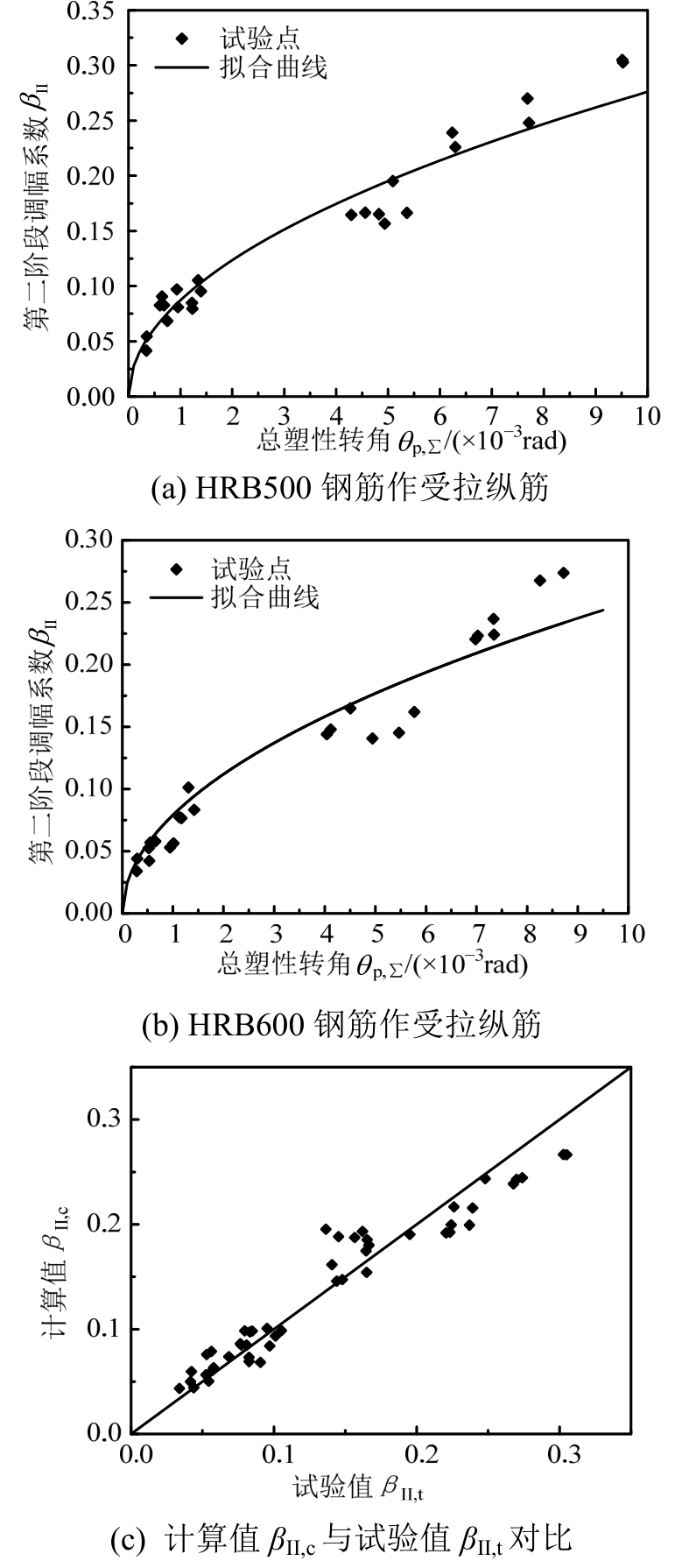 以总塑性转角θp,Σ为横坐标、以梁端控制截面第二阶段弯矩调幅系数βII为纵坐标建立坐标系,则混凝土强度等级C40~C60、相对受压区高度介于0.1~0.4的HRB500钢筋、HRB600钢筋作纵向受拉钢筋的框架梁端第二阶段弯矩调幅系数βII拟合曲线分别如图38(a)、图38(b)所示,经拟合按下式 计算: