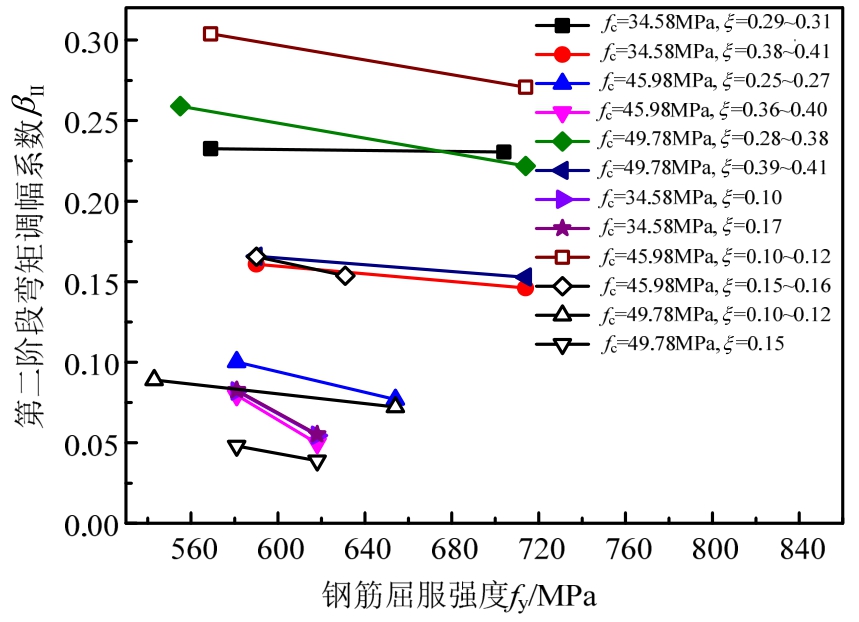 图34为fc、ξ和lah/d相同时,第二阶段弯矩调幅βII随fy的变化情况。钢筋屈服强度的提高使截面屈服曲率增大,塑性铰转动能力降低,故βII随fy的增大而减小。以HRB500钢筋作受拉纵筋的框架梁端第二阶段弯矩调幅系数为基准,引入钢筋屈服强度对第二阶段弯矩调幅影响系ηsII,按下式计算: