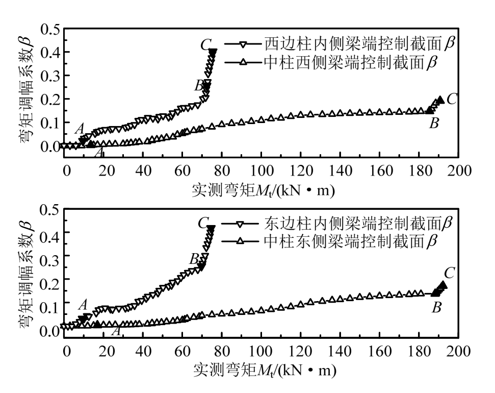 其中:Me,i、Mt,i分别为加载至第i级荷载时,梁端控制截面弹性弯矩计算值和弯矩实测值;Me,u为极限荷载作用下,梁端控制截面弹性弯矩计算值。需要指出,由于框架中柱两侧梁端和边柱内侧梁受拉纵筋不会同时屈服,各梁端区域形成塑性铰后框架计算简图会发生变化,其他控制截面弯矩调幅对象应根据变化后简图计算。