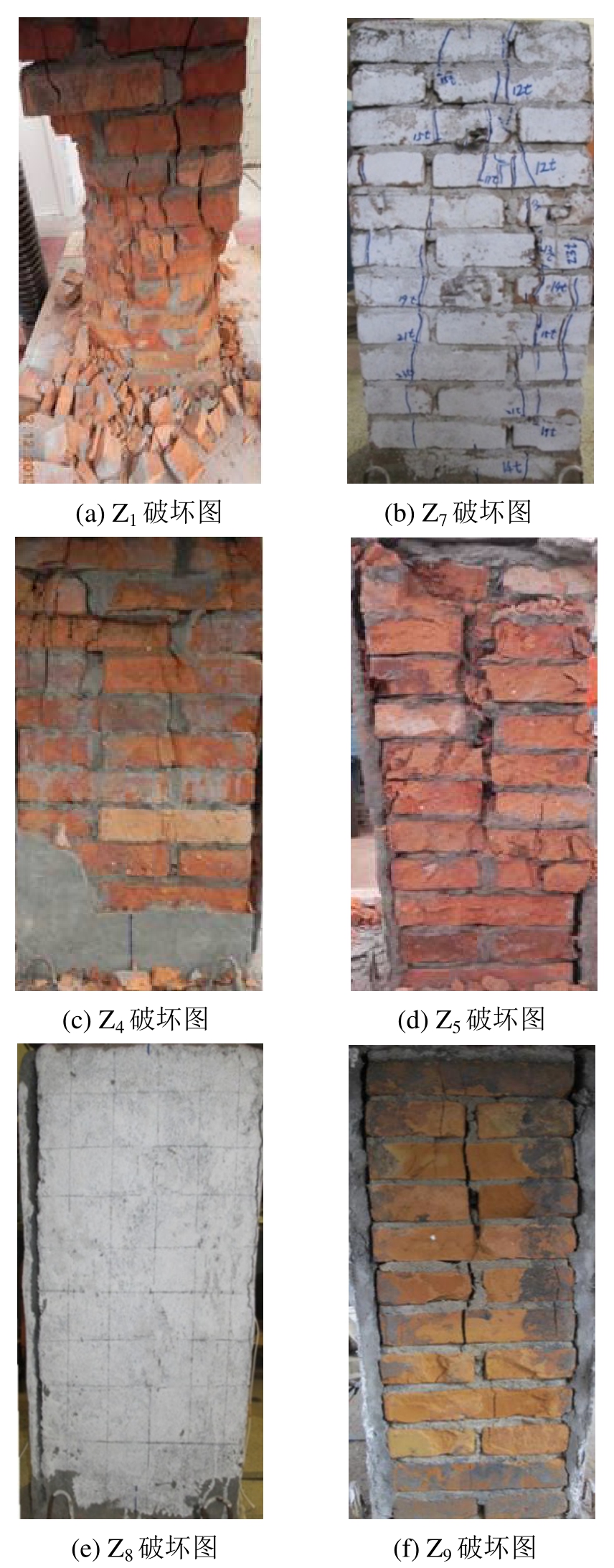 1)未加固砖柱(试件Z1、Z6、Z7)受压破坏时,由于水泥砂浆和块体的抗拉强度均较低,横向拉应力达到其抗拉强度时,砖柱开裂,竖向裂缝贯通。砖柱破坏时被竖向裂缝分割成若干个独立的细长小柱体,最终因小柱体失稳或压碎而破坏,试件呈明显脆性破坏特征。