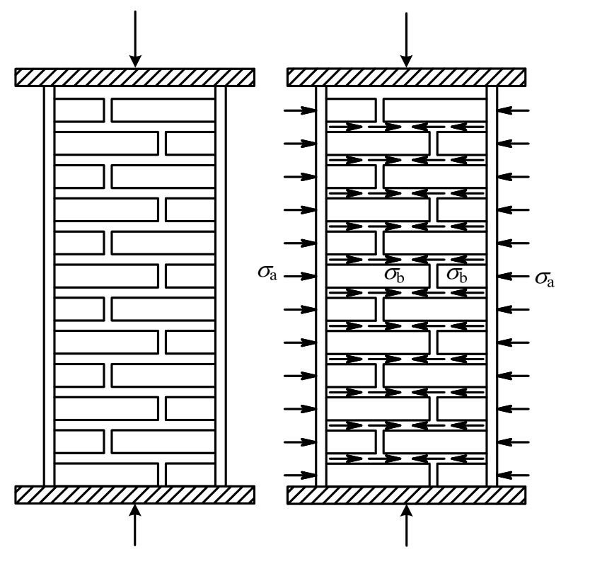 5)试件Z5的极限荷载、峰值压应变均为最高,说明HDC作为砌筑砂浆和加固面层对砖柱均产生了约束作用,使砖柱处于三向受压状态,大幅度提高了砖柱的轴压承载力和变形能力,显著改善了砖柱延性,约束应力如图5所示,图中σa为HDC面层产生的约束应力,σb为HDC作为砌筑砂浆产生的约束应力。