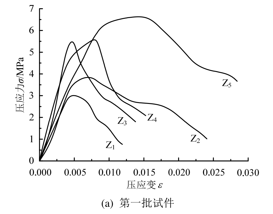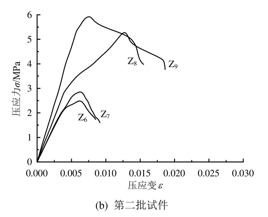 根据试件受压的荷载-变形曲线,得到其应力-应变曲线如图6所示,从图中可以看出: