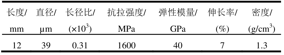 长度/ mm直径/ µm长径比/ (×103)抗拉强度/ MPa 弹性模量/ GPa 伸长率/ (%)密度/ (g/cm3)12 39 0.31 1600 40 7 1.3