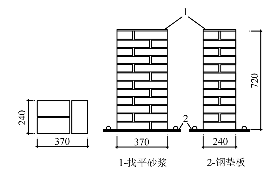 试验共设计了9组(27个)砖柱,每组为3个试件。按照《砌体基本力学性能试验方法标准》[16],采用尺寸为240 mm×115 mm×53 mm的烧结普通砖砌筑。试件设计尺寸为240 mm×370 mm×720 mm,高厚比为3,如图1所示。9组试件的设计方案与试件编号详见表1。试件设计时考虑M1.0、M2.5、M15这3个砌筑砂浆设计强度等级。