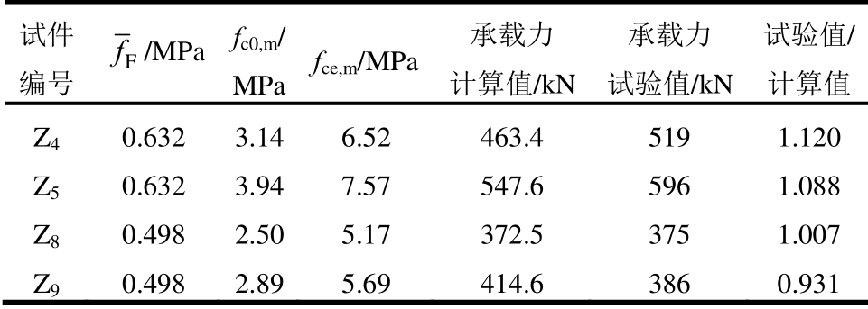 试件 编号 F f/MPa fc0,m/ MPa fce,m/MPa 承载力 计算值/kN 承载力 试验值/kN试验值/计算值Z40.632 3.14 6.52 463.4 519 1.120 Z50.632 3.94 7.57 547.6 596 1.088 Z80.498 2.50 5.17 372.5 375 1.007 Z90.498 2.89 5.69 414.6 386 0.931