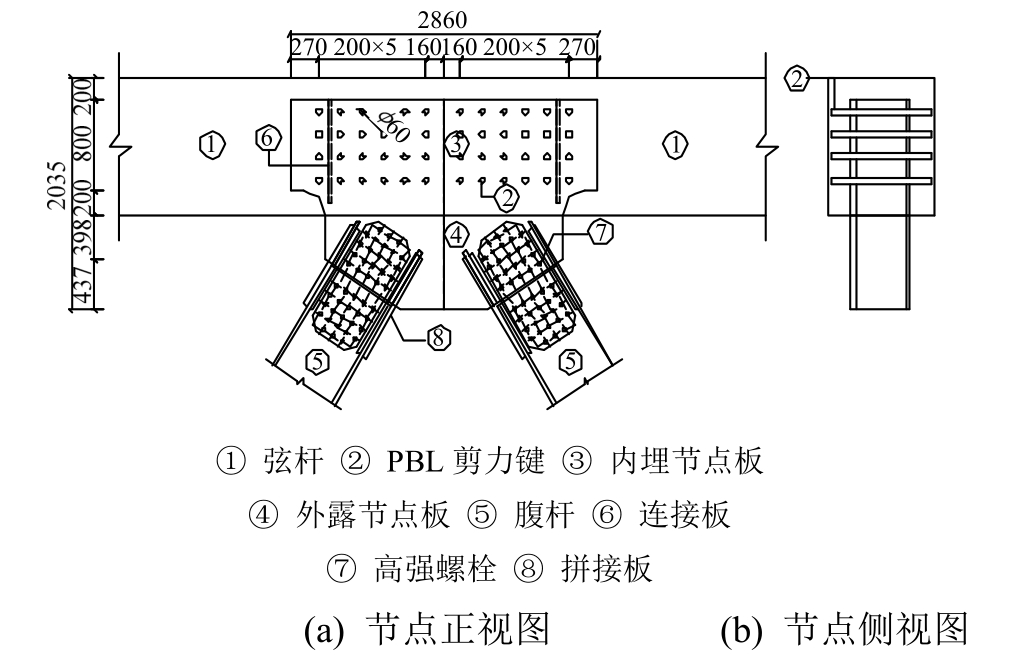 该桥设计等级为铁路I级,双线上承式,结构形式采用钢桁腹-混凝土连续梁,主要由混凝土弦杆、方钢管腹杆、混凝土顶底板以及混凝土墩顶块组成,图1中所示节点详图如图2所示。