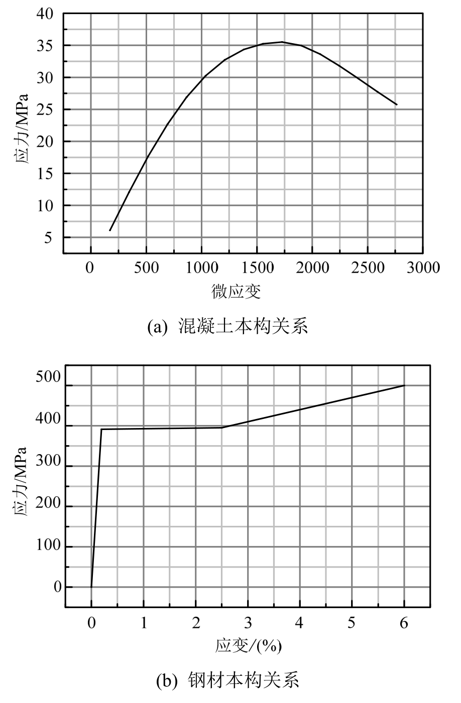 弦杆采用solid65单元模拟,solid65单元可用于模拟加筋的3D实体结构,具有受拉开裂的性能。模型中考虑材料非线性的影响,混凝土采用多线性随动强化准则,根据《混凝土结构设计规范》(GB50010—2010)附录C中定义的本构关系,如图11(a)所示。混凝土弹性模量Ec=35500 MPa,泊松比为0.2,破环准则采用Willam-Warnke五参数破环准则。