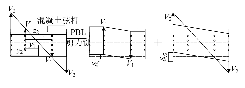 当有2n排剪力键时,根据材料力学相关理论以及叠加原理,弦杆在每对Vi作用下的变形分 别为:
