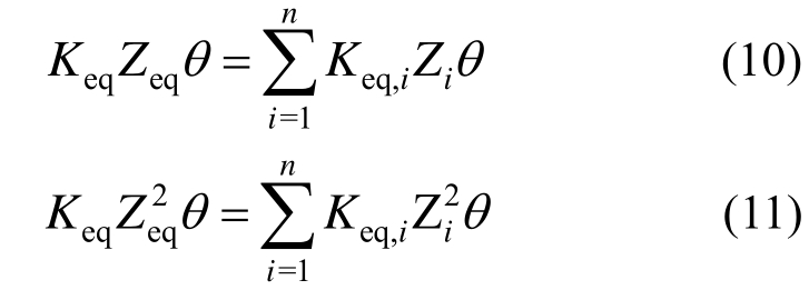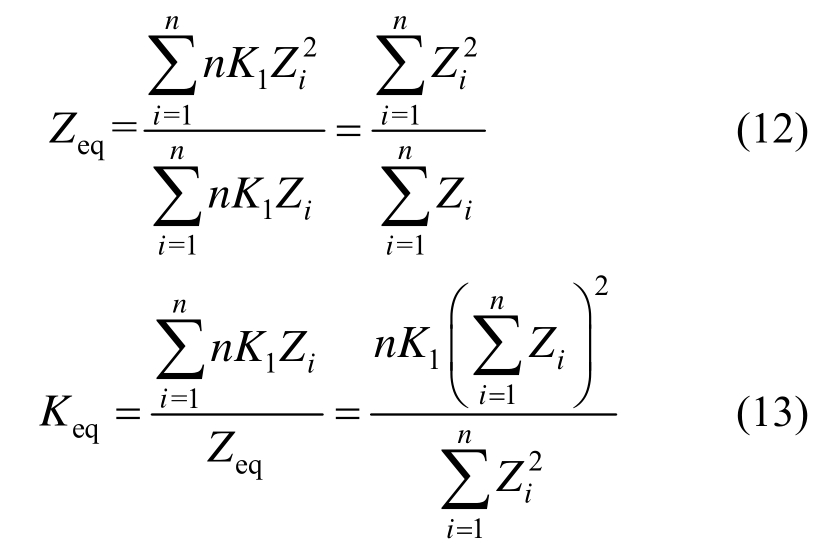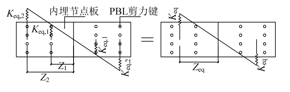 节点域内PBL剪力键横穿内埋节点板,并与内埋节点板协同受力,根据已有的实验可知,内埋节点板相对于弦杆的转动变形,主要由PBL剪力键群的变形引起,两者不相互独立,故此处将内埋节点板与PBL建立键合成一个组件分析。假定内埋节点板在PBL剪力键群作用下,转动中心在剪力键群形心处,对于受力相同而位于不同高度处的剪力键(例如各列剪力键受力相同但到形心的距离不同),可以用一个等效力臂Zeq来代替原来的力臂Zi,从而得到不同高度剪力键的等效刚度Keq,转换模型如图7所示(以四排剪力键为例)。