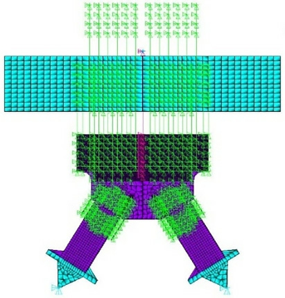 基于有限元程序A NSYS建立了节点三维非线性有限元模型,节点模型主要包括弦杆、节点板、横隔板、连接板、PBL剪力键、腹杆、支座七大部分。需要说明的是,为了较为准确地模拟节点域的边界条件,建模时考虑了钢腹杆以及节点域外弦杆。混凝土弦杆采用SOLID65单元模拟,节点板、连接板、横隔板与腹杆均采用SHELL181单元模拟,PBL剪力键采用BEAM188单元模拟,混凝土弦杆与PBL剪力键、节点板、横隔板的连接以及高强螺栓均采用节点自由度耦合模拟。模型采用映射网格划分,实体单元、板单元以及梁单元的划分尺寸约为50 mm,模型如图10所示。